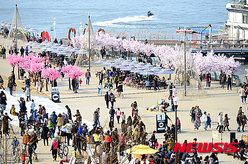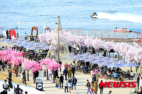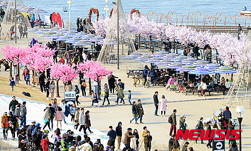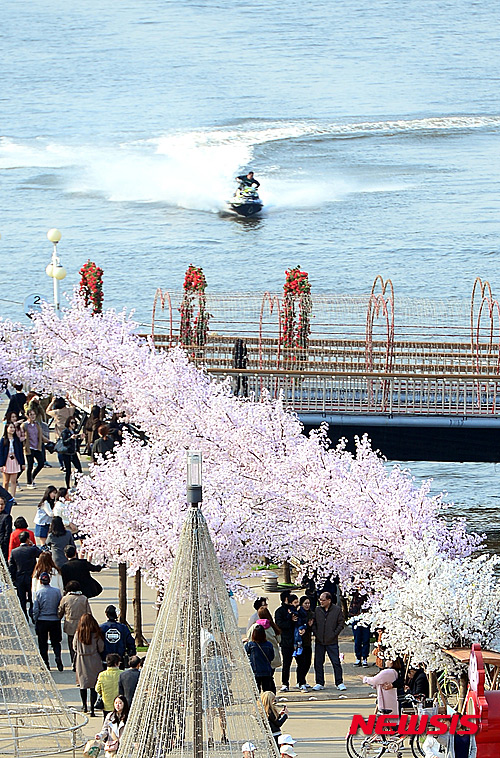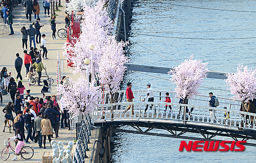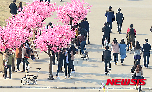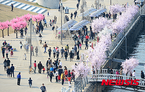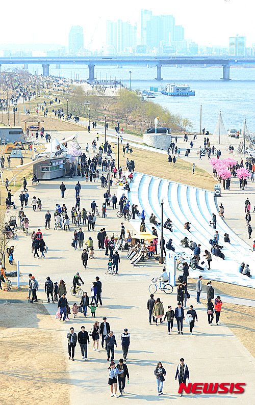 全国的に春らしい温かさとなった27日午後、ソウル市永登浦区汝矣島の漢江公園では、3月最後の日曜日を楽しむ市民でにぎわった。