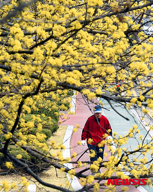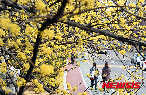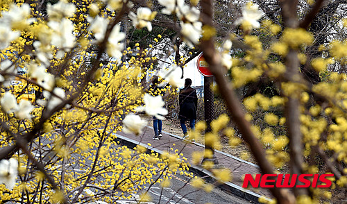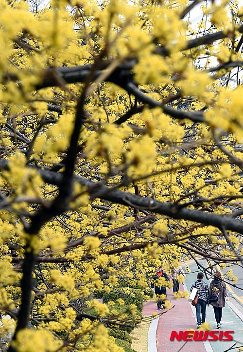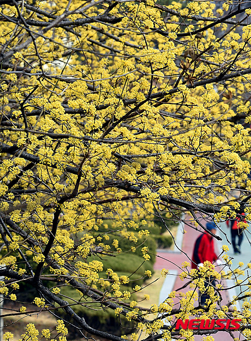 はっきり春らしい天気となった29日午後、京畿道水原市八達山付近の散策路では、見事に咲き誇るサンシュユの下を市民が散歩し、春の気配を満喫していた。