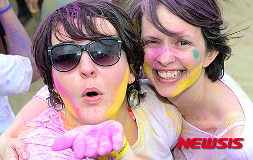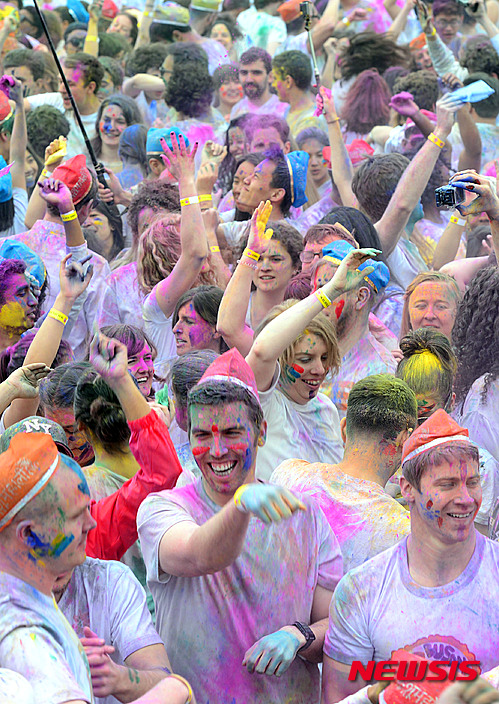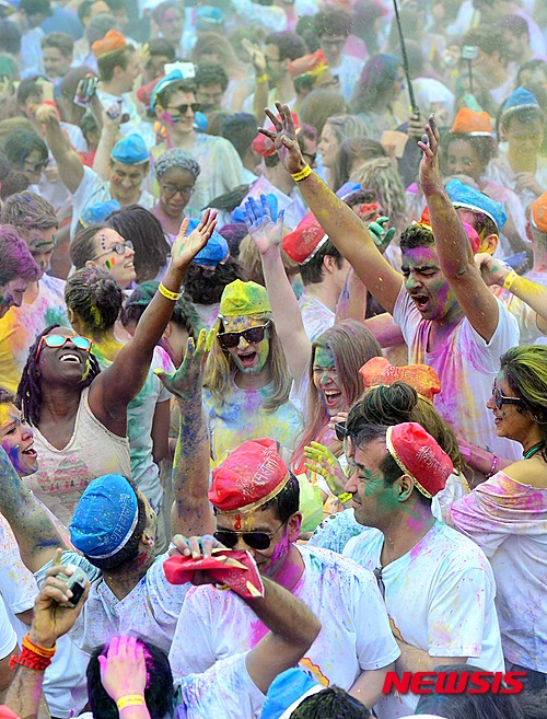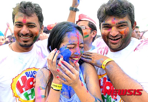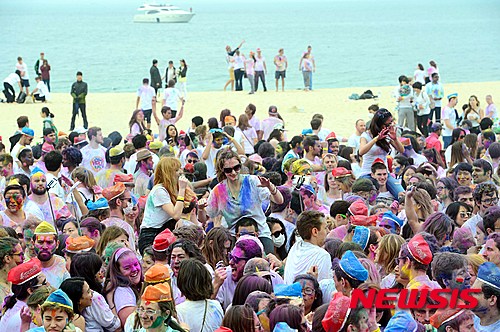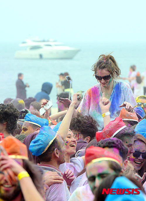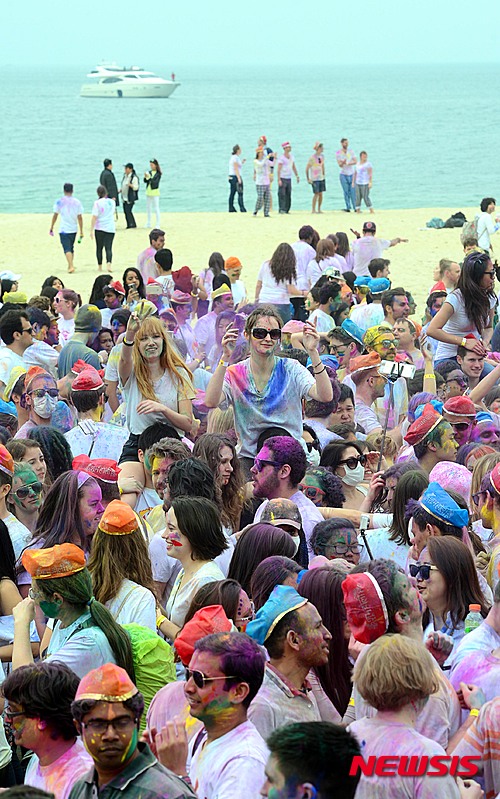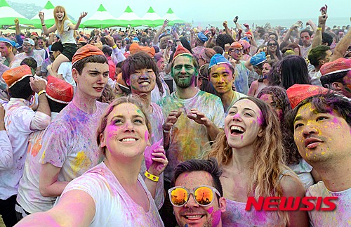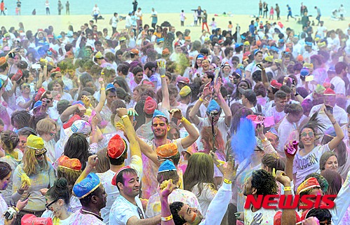 3日午前、釜山市内の海雲台海水浴場で、インドの春祭り「ホーリー祭」が開催された。写真は、全身に色とりどりの粉をかけて踊る外国人参加者たち。