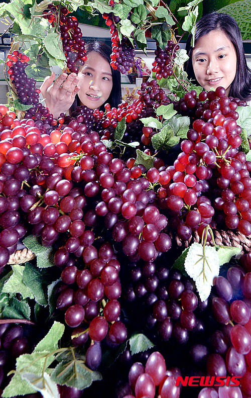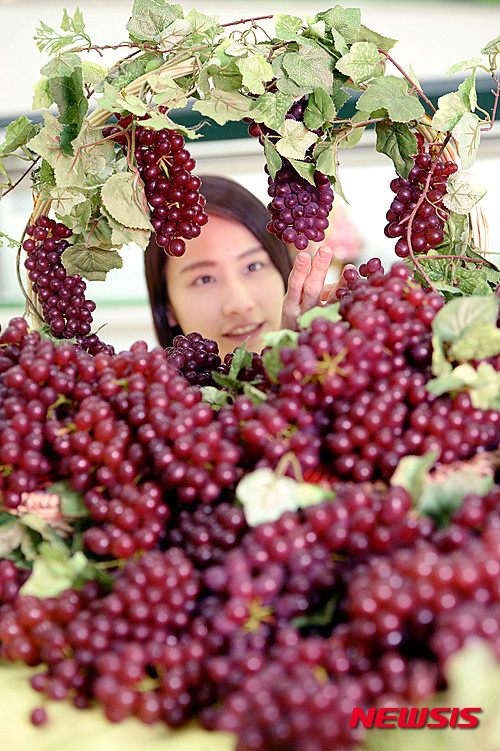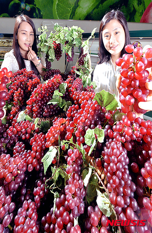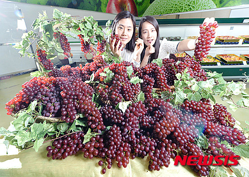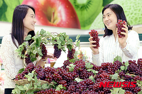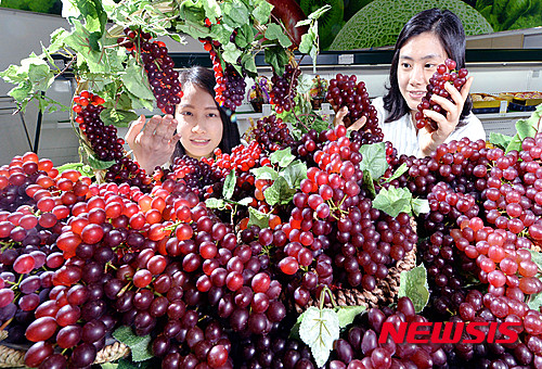 4日午前、ソウル市瑞草区の大型スーパー「農協ハナロ・クラブ」で、今年初出荷された韓国産「デラウェア」が店頭に並んだ。