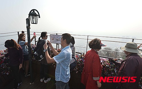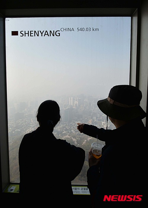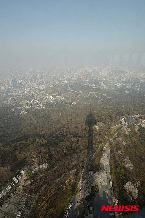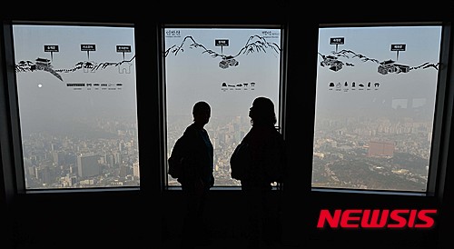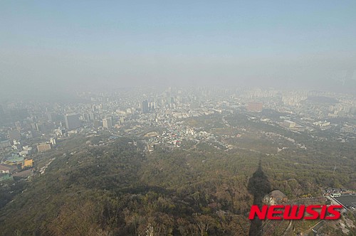 ソウルにPM2.5注意報が発令された8日午後、南山タワーから見たソウル都心はぼんやりとかすんでいた。
