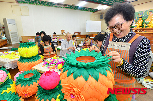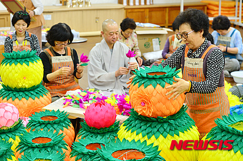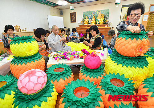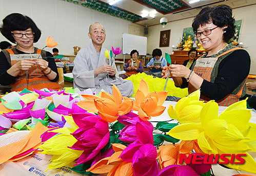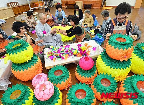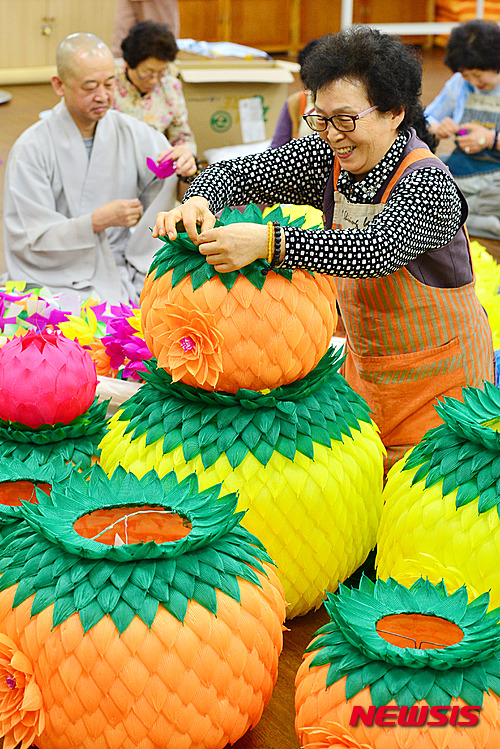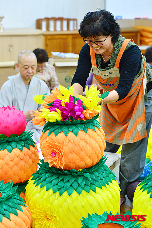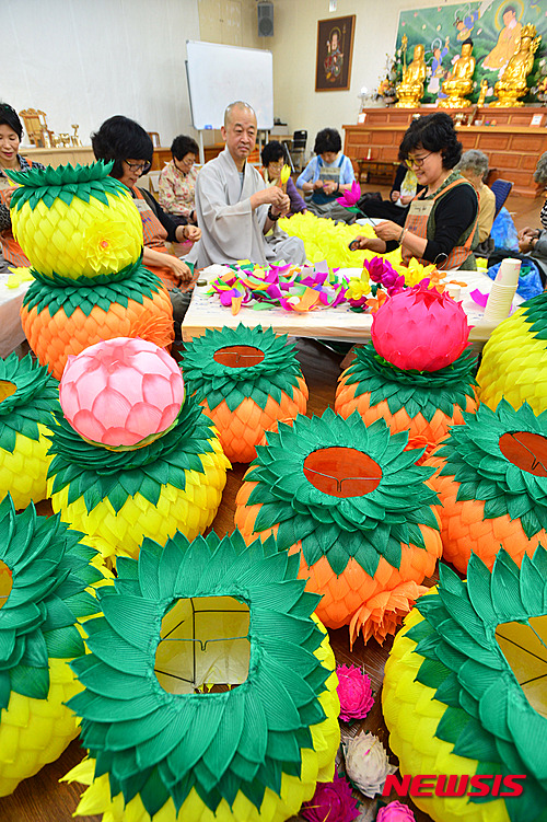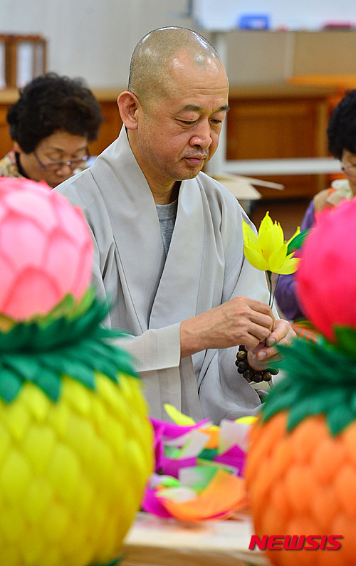 仏生日(陰暦4月8日。今年は5月14日)まであと20日余りとなった25日午後、大邱市南区の韓国仏教大学大観音寺で、法会に用いる「燃灯」を作るジンミョン僧侶と信徒の様子。