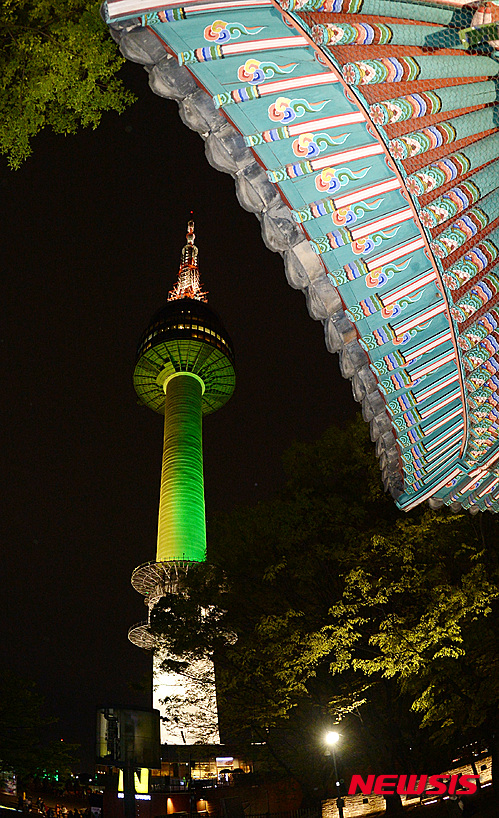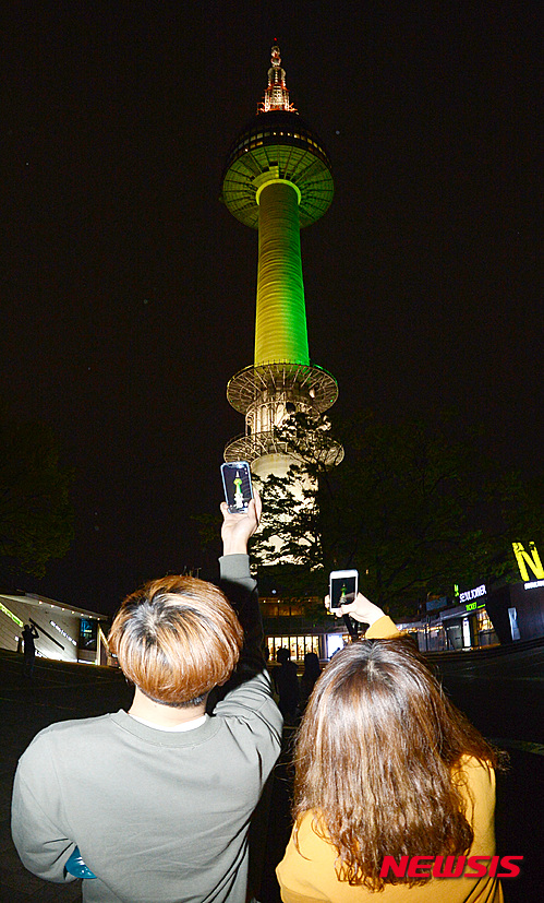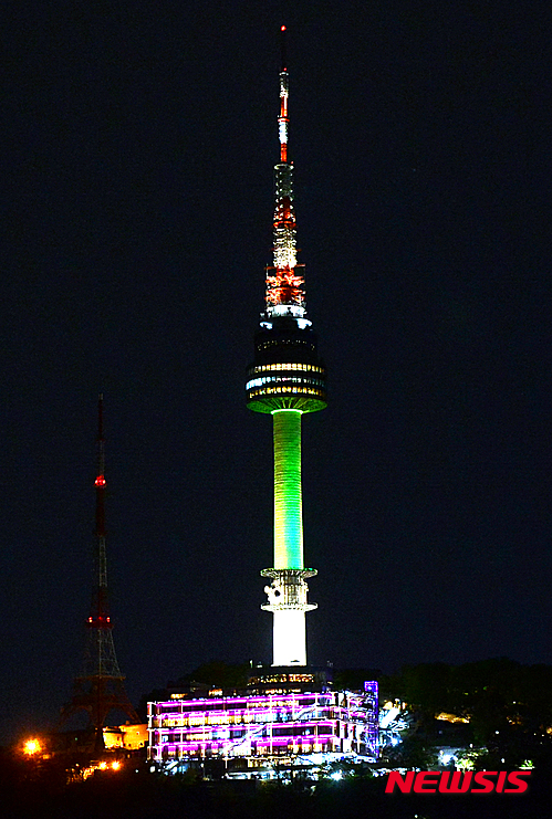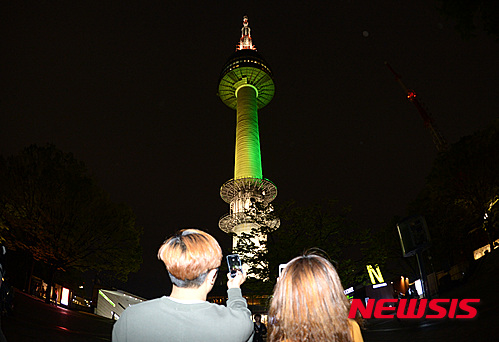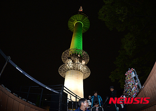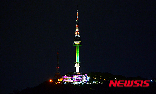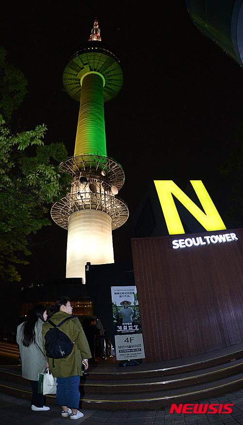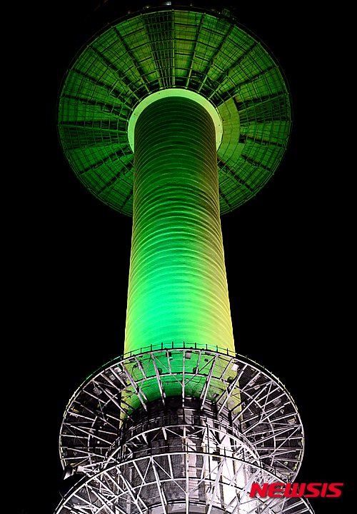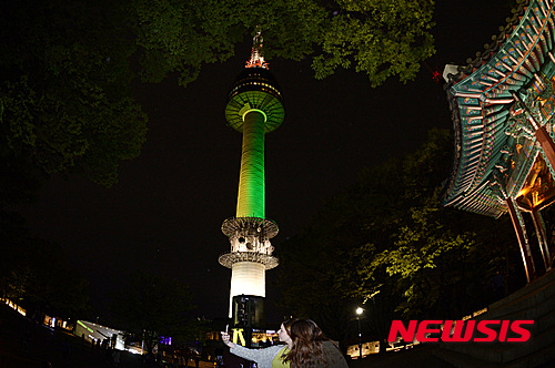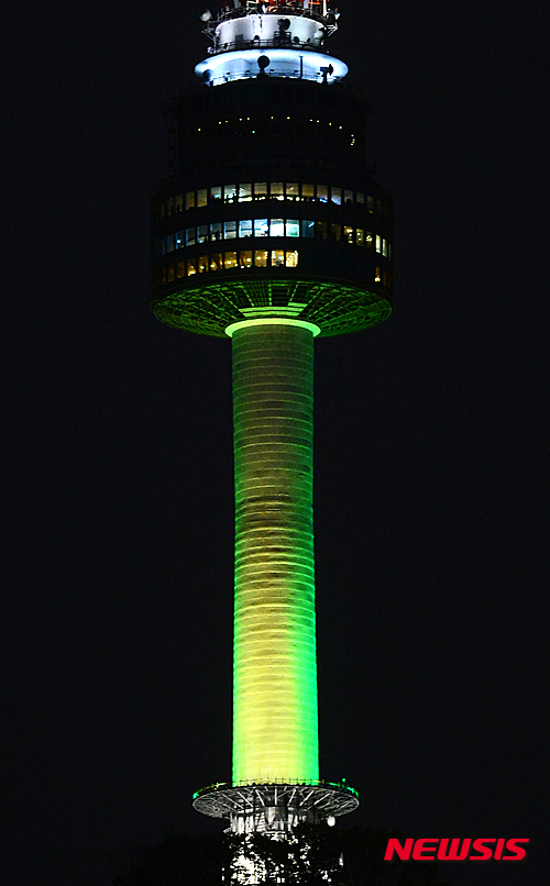 ブラジル・リオデジャネイロ五輪開幕まであと100日となった27日午後、ソウル市竜山区のNソウルタワーは、ブラジルを象徴する黄色と緑でライトアップされた。