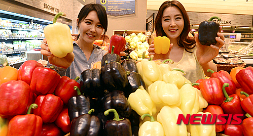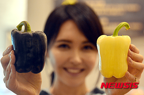 新世界デパート本店(ソウル市中区)食品館の農産コーナーで3日午前、 アイボリーや深紫など色とりどりのパプリカの販促イベントが開かれた。