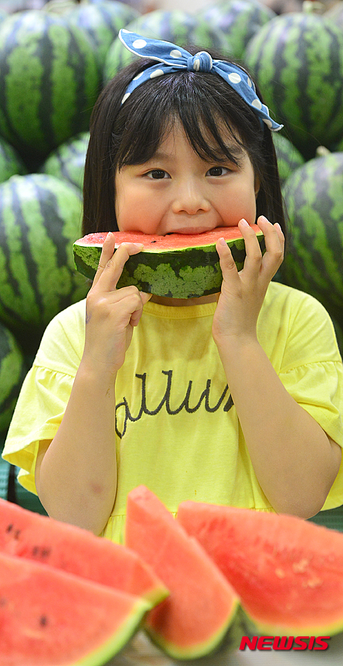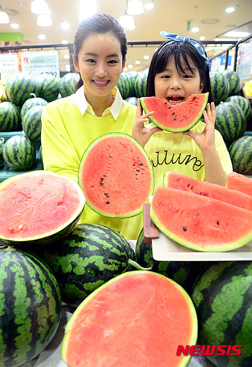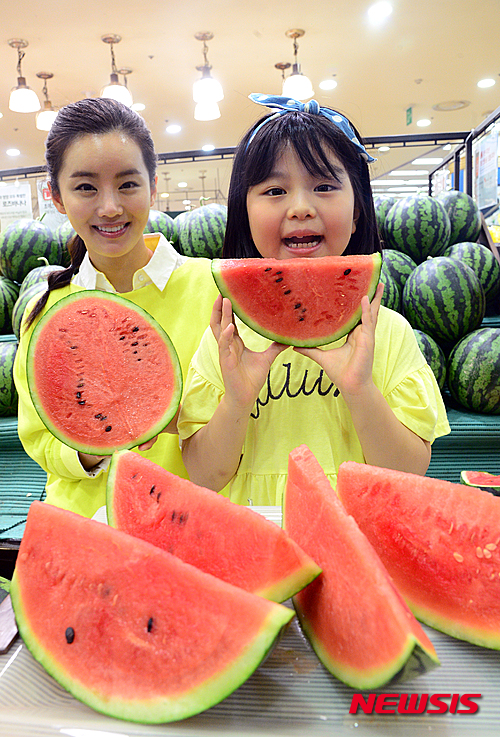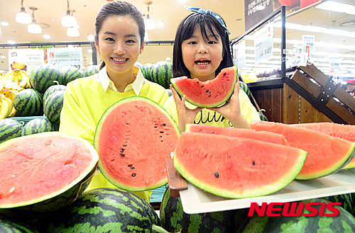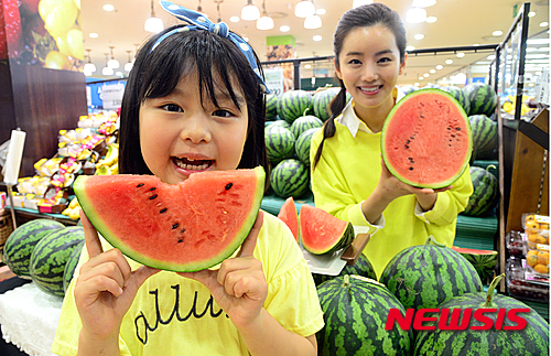 ソウル市中区のロッテマート・ソウル駅店で3日午前、慶尚南道咸安、忠清南道論山・扶余などで栽培されたスイカの販促イベントが開かれた。