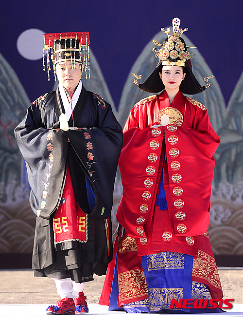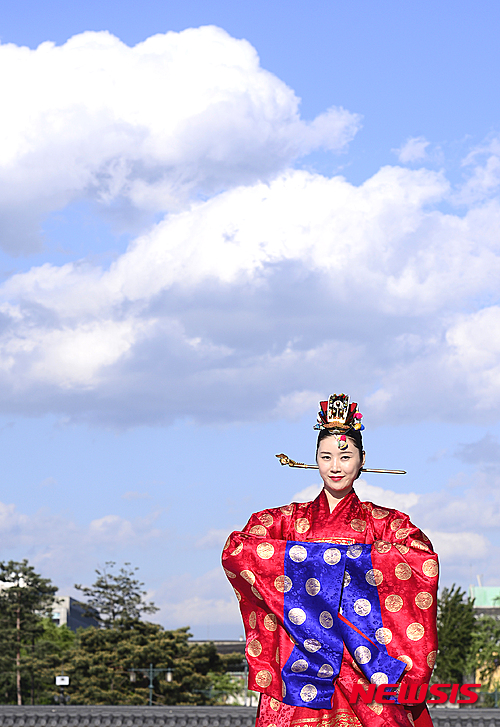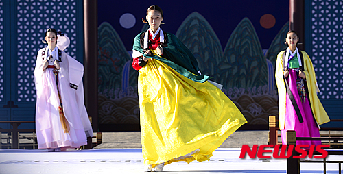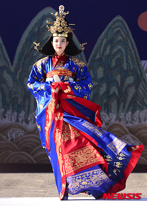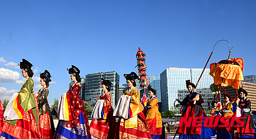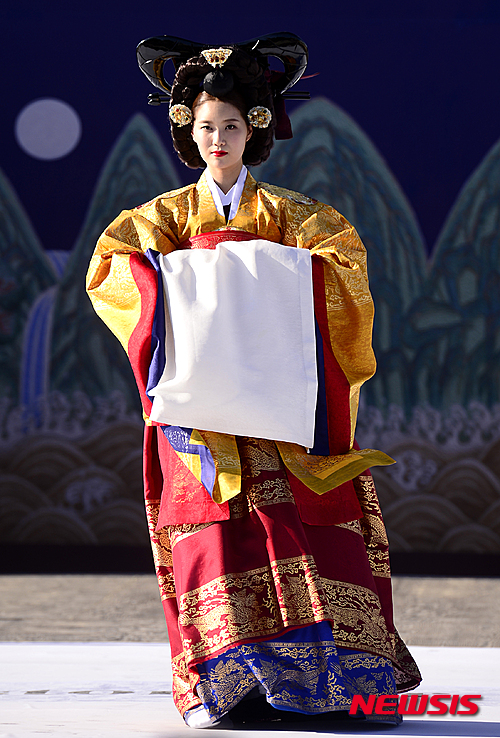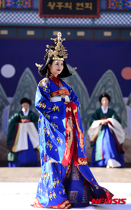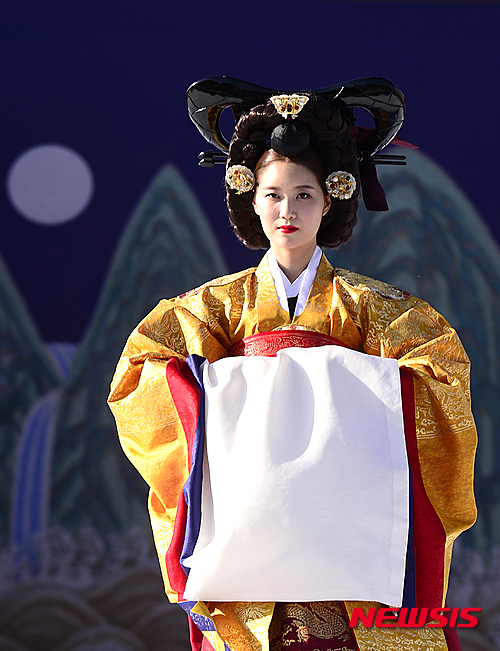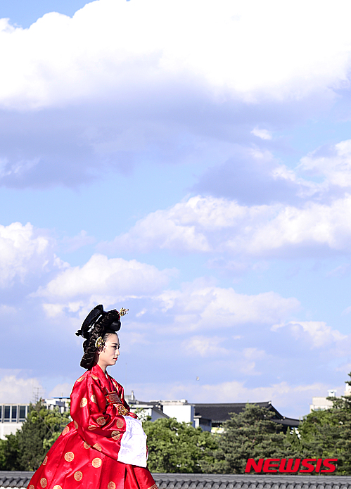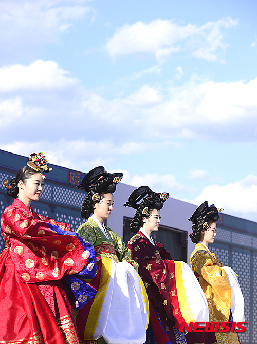 4日午後、ソウル市鍾路区の景福宮内にある興礼門で、宮廷服飾ファッションショー「王后の宴」が開催された。写真は宮中の韓服を着て歩くモデルたち。