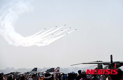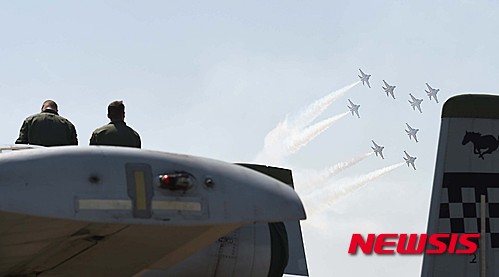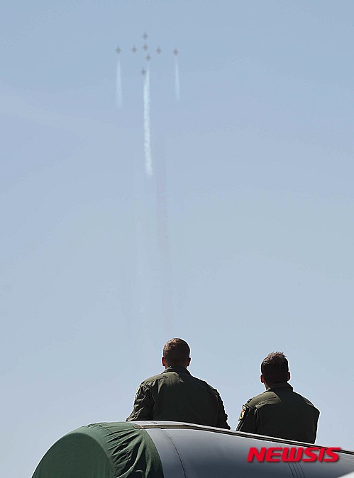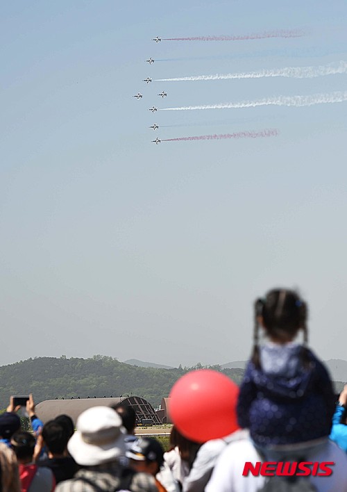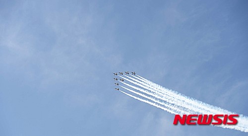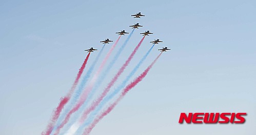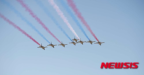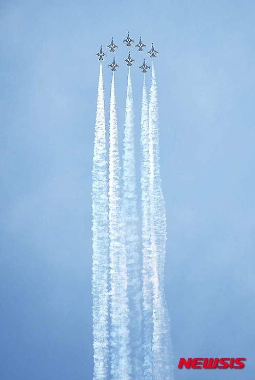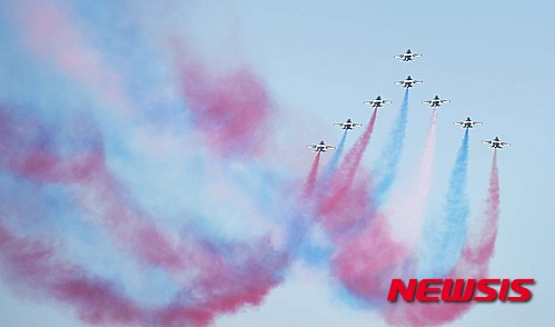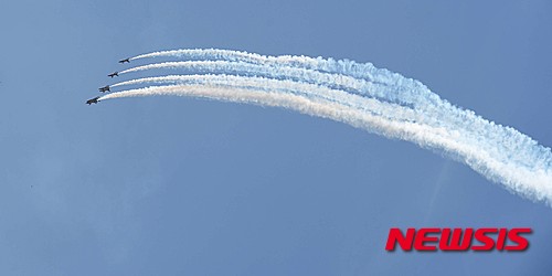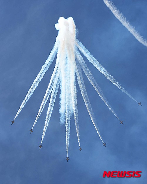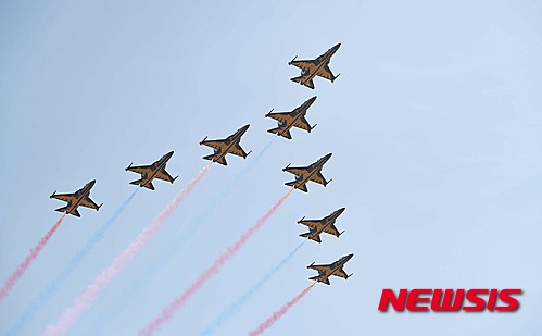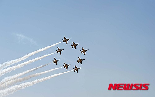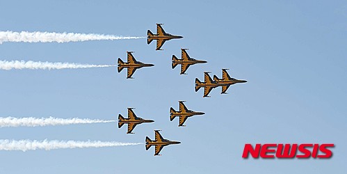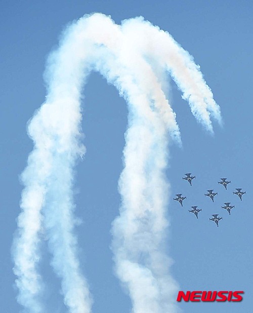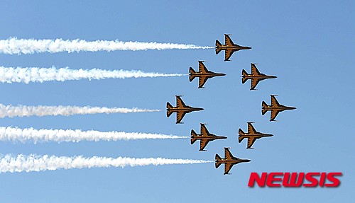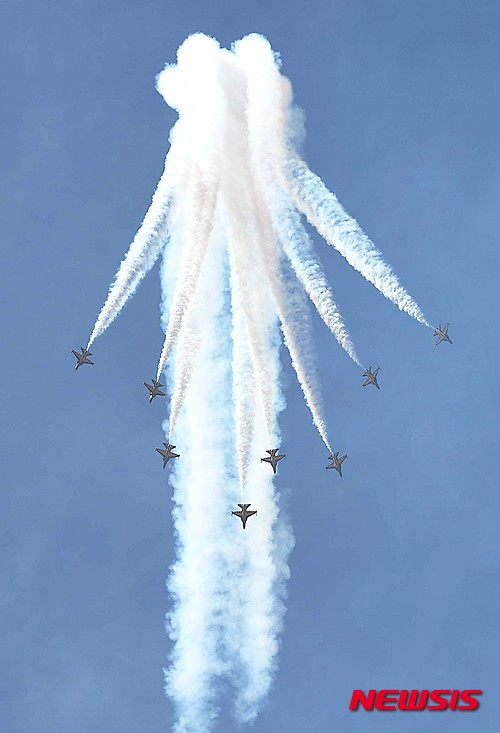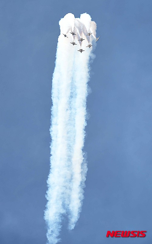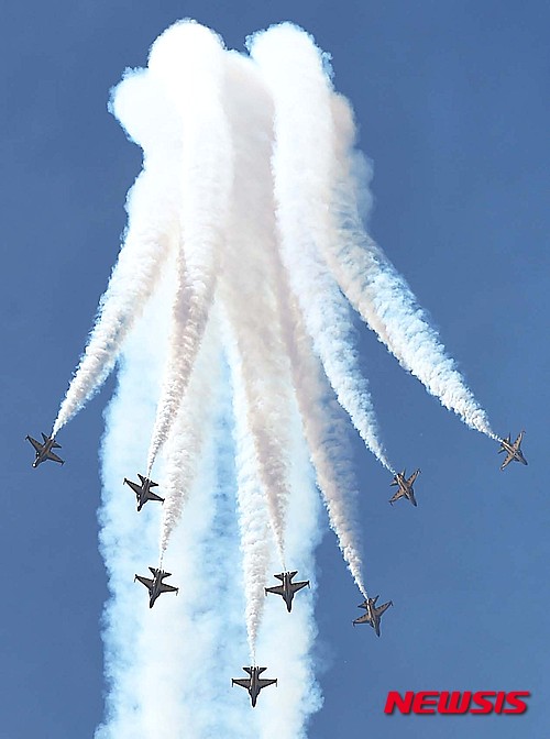 京畿水原航空科学展が始まった7日午前、京畿道水原空軍飛行場で、韓国空軍の特殊飛行チーム「ブラックイーグルス」の曲技飛行が披露された。