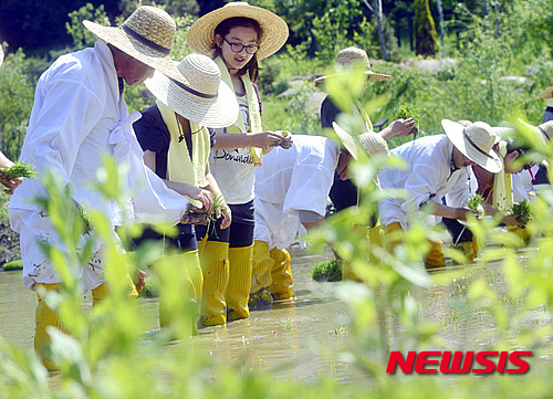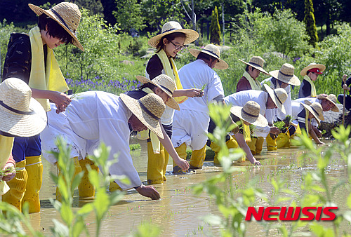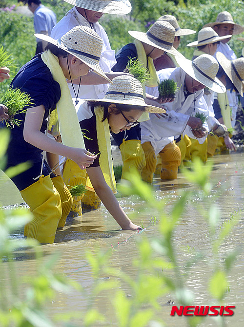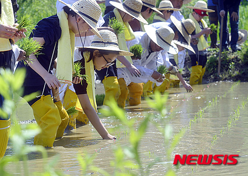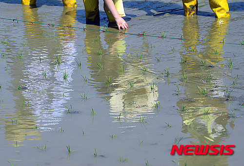 11日午前、都市農業公園(ソウル市江東区)内の水田で、学生らが田植え体験を行った。