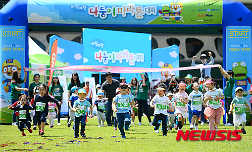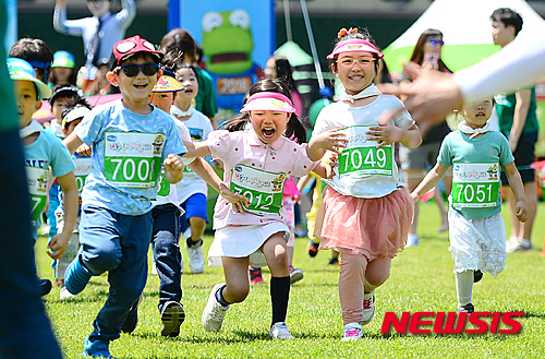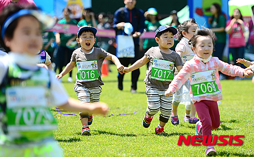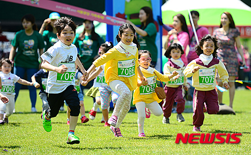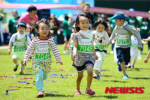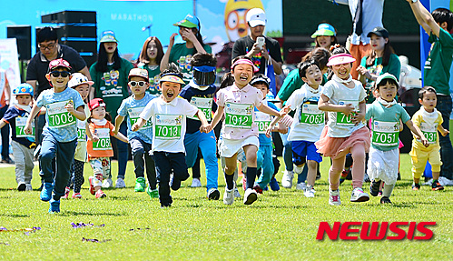 ソウル市中区のソウル広場で14日午前、「子だくさんマラソン大会」が開かれた。写真は、参加した子どもたちが力一杯走っているところ。