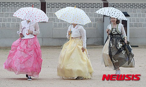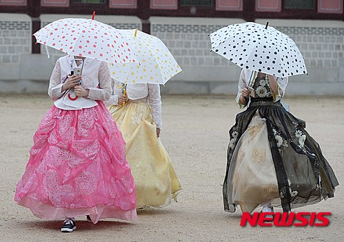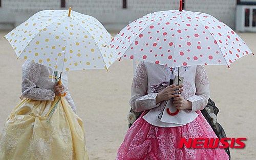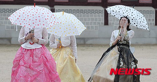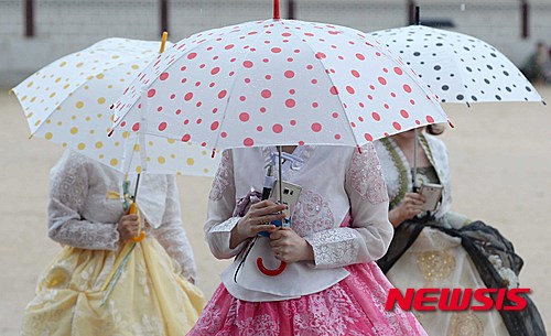 午後から全国的に雨となった15日午後、ソウル・景福宮では韓国の伝統衣装「韓服」を着た外国人観光客が雨の中を歩いていた。