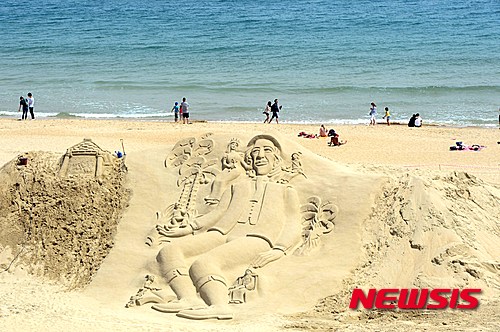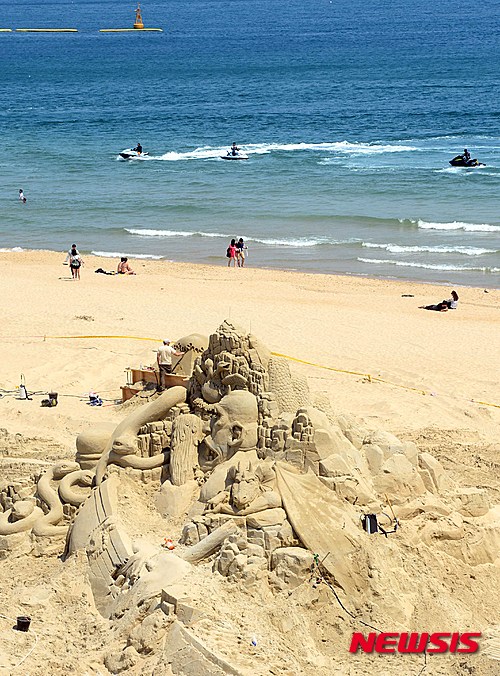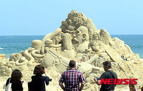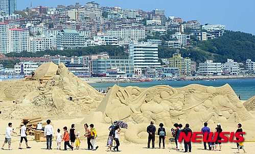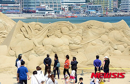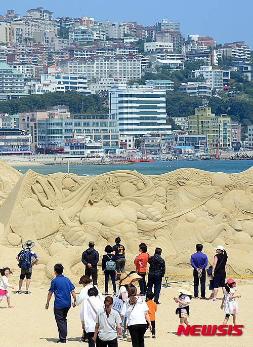 22日午後、釜山市内の海雲台海水浴場には、大勢の観光客や地元の人々が特大の砂の彫刻作品に見入っていた。