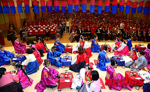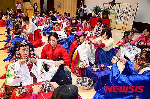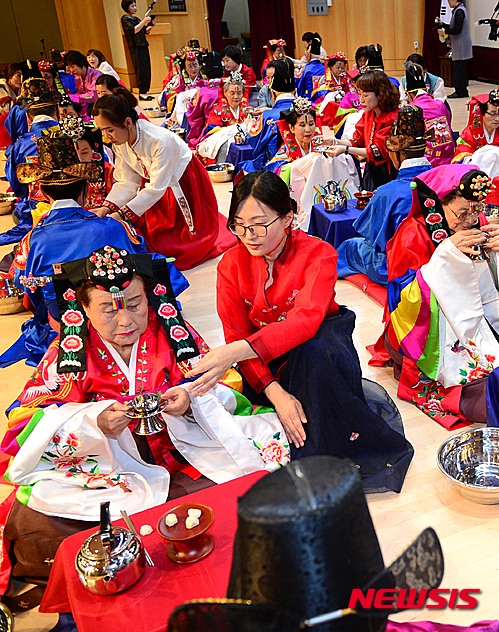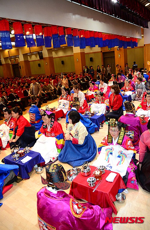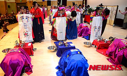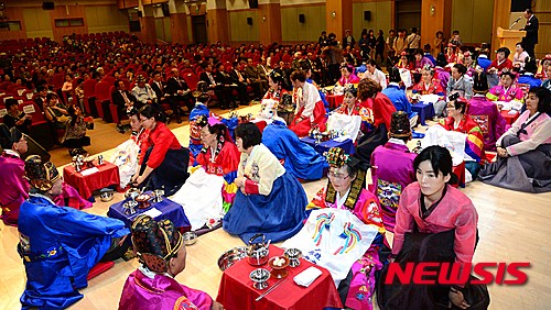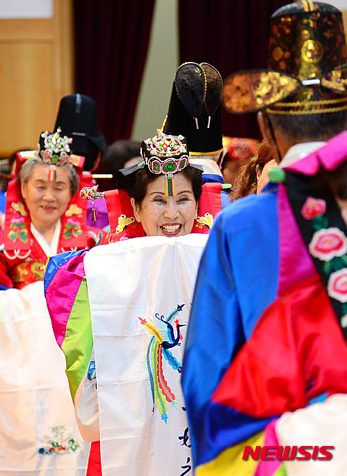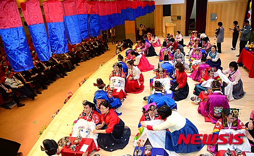 釜山市庁大講堂で24日午後、長寿夫婦15組が伝統の「回婚礼」を挙げた。 回婚礼とは、長年連れ添った夫婦が婚姻60周年を祝う記念の宴のことで、この日の行事は大韓老人会釜山市連合会が用意した。