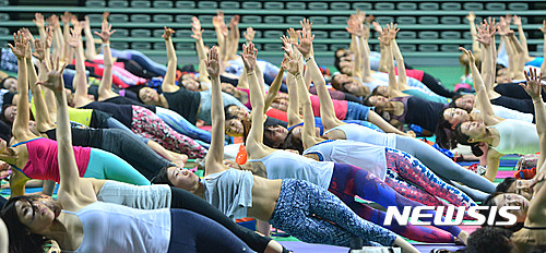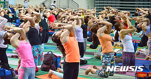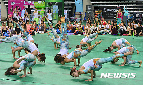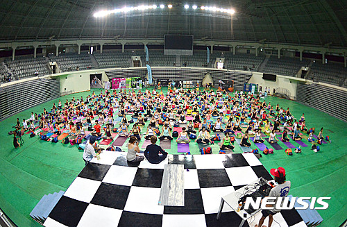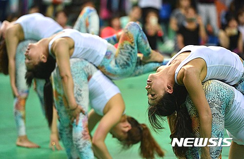 12日午前、ソウル市中区の奨忠体育館で「第8回コリア・ヨガ・マラソン」が開催された。写真はさまざまなポーズを披露した「ナディア・ヨガ」のチーム。