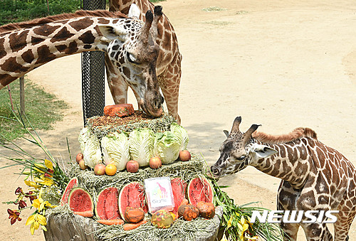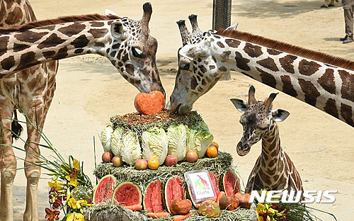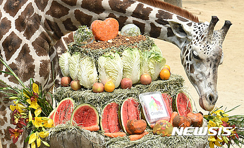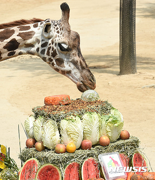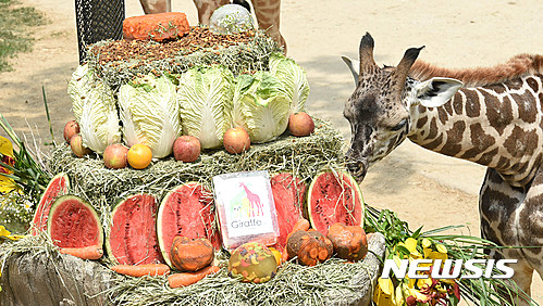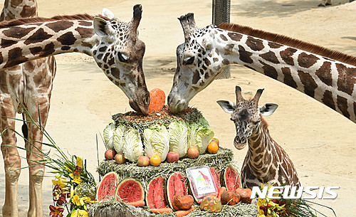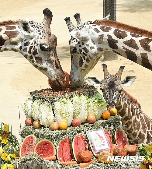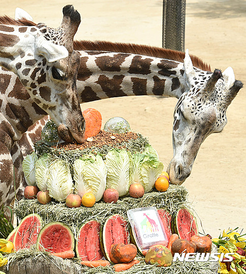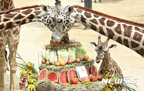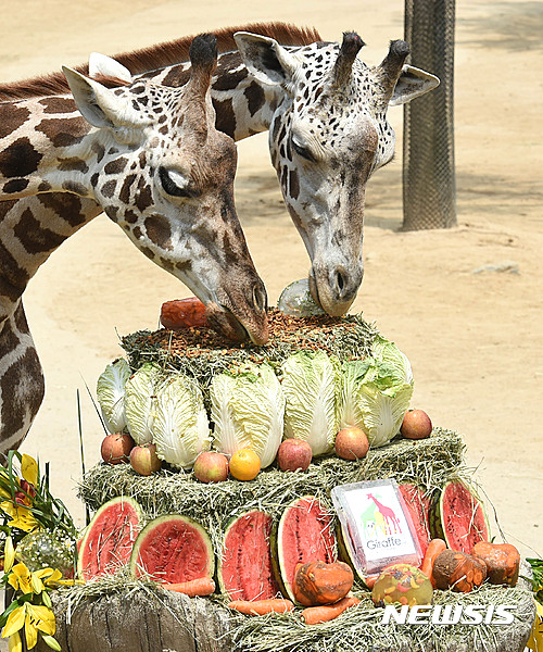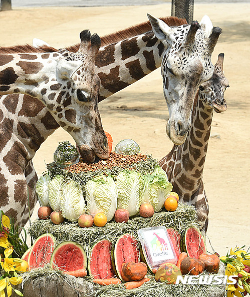 「世界キリンの日」の21日午前、竜仁エバーランドのキリンたちに健康食が振る舞われた。