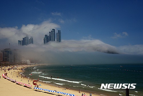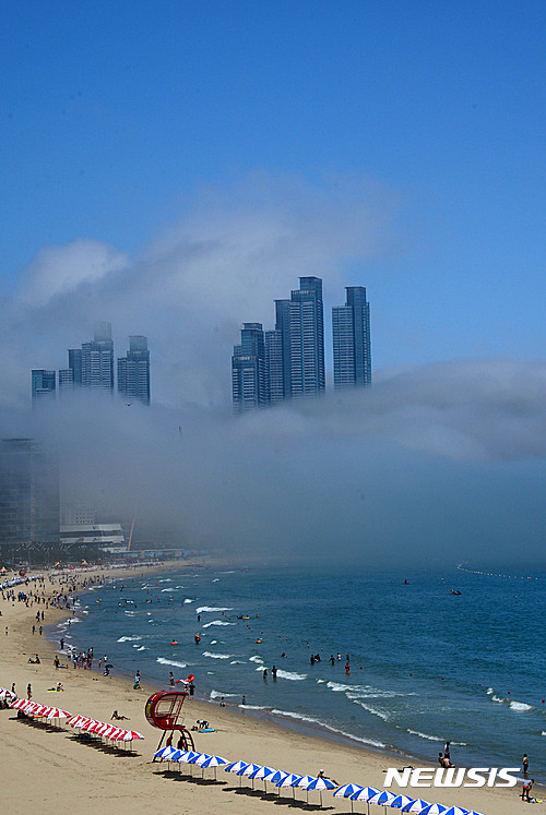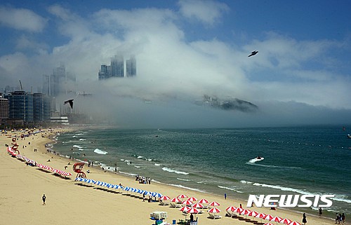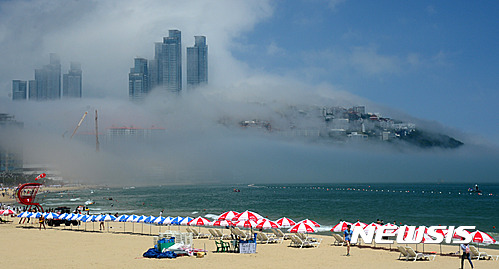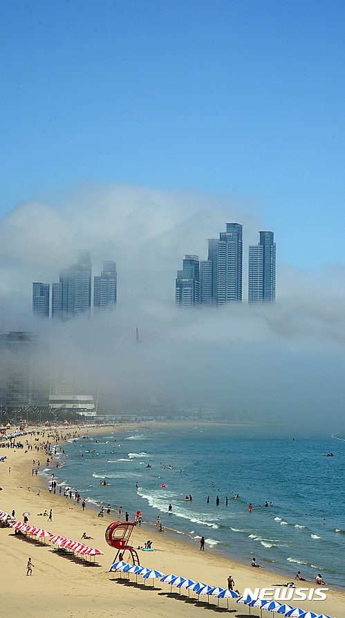 梅雨も一休みの6日午後、釜山の海雲台海水浴場では久々の青空がみられたが、「月見の丘」付近には濃い海霧がかかり、異色の風景が出現した。