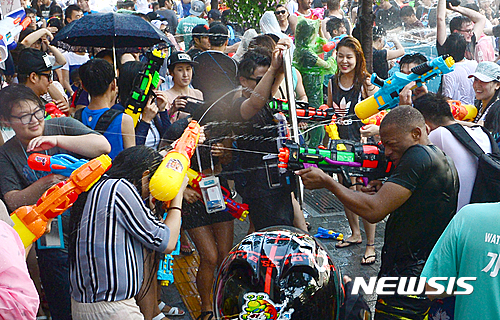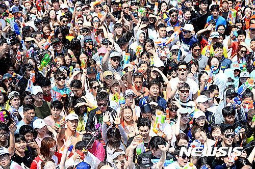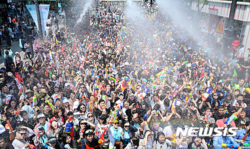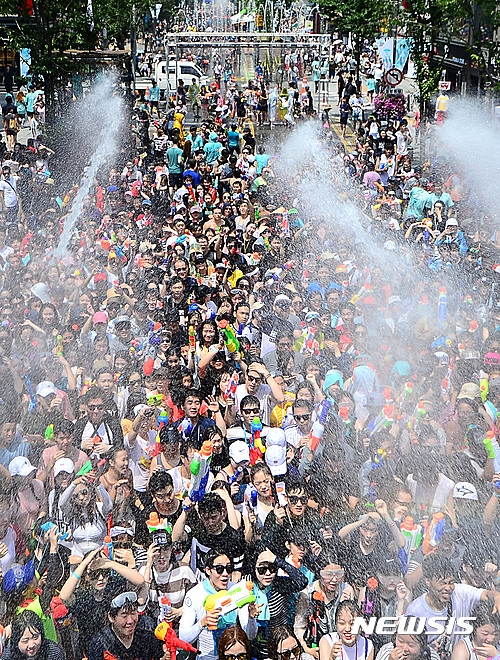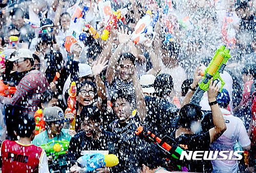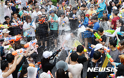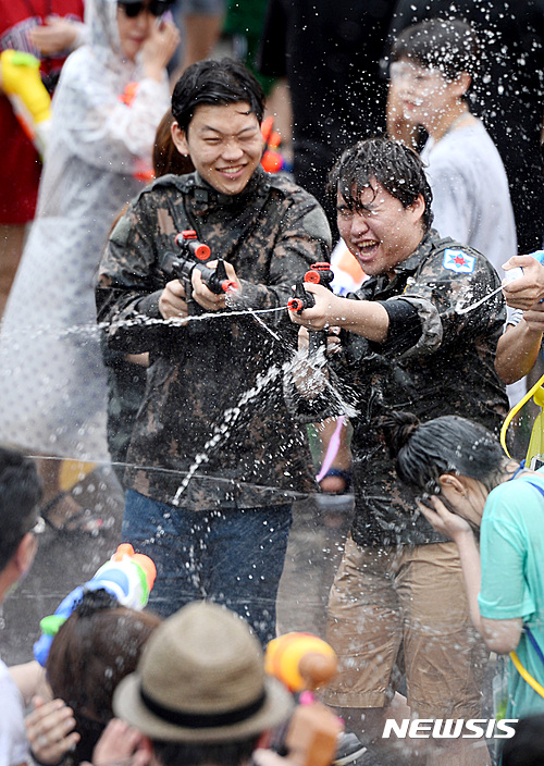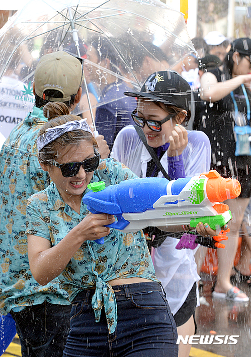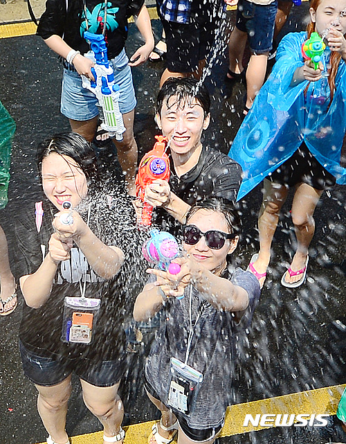 10日午後、ソウル市西大門区新村の延世路で「2016新村水鉄砲祭り」が行われた。写真は水鉄砲で暑さを吹き飛ばし、楽しむ参加者たち。