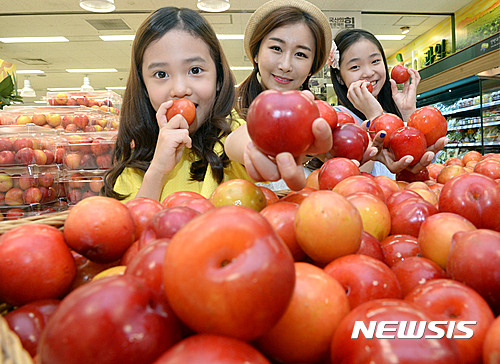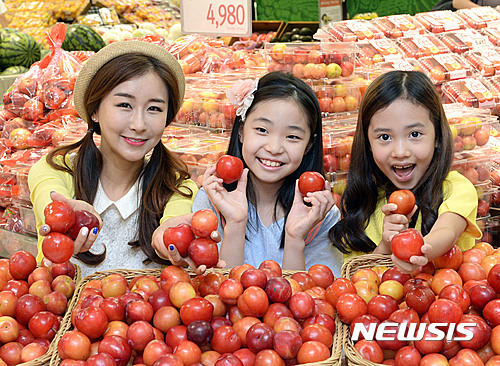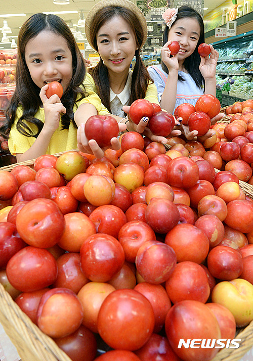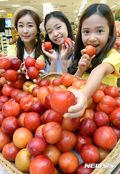 Eマート竜山店の果物売場で11日、「甘酸っぱい大石スモモ」(大石早生)の販促イベントが開かれた。Eマートは、慶尚北道金泉、義城、栄州などで収穫された大石スモモを韓国国内の各店舗で販売している。