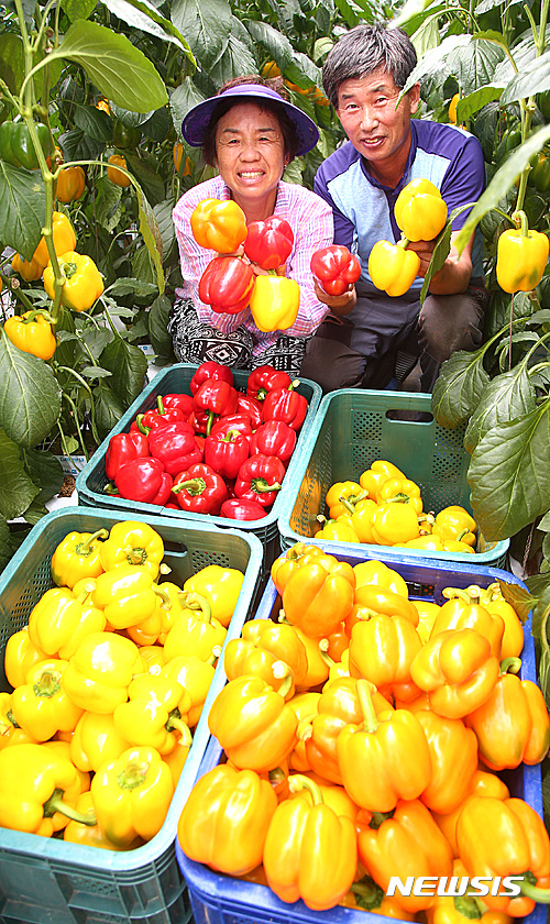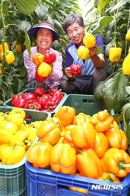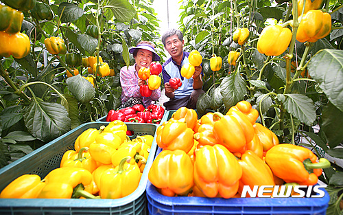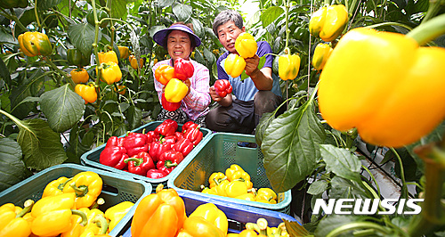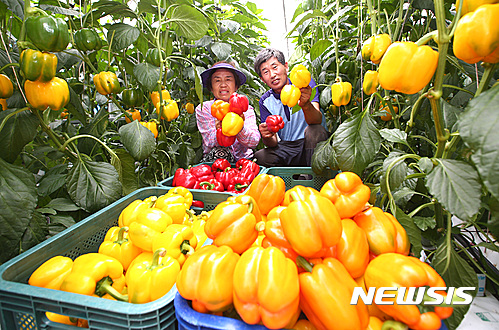 12日、慶尚南道咸陽郡の農家がパプリカの収穫を行っている。