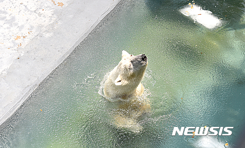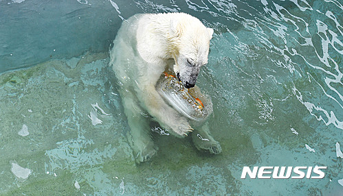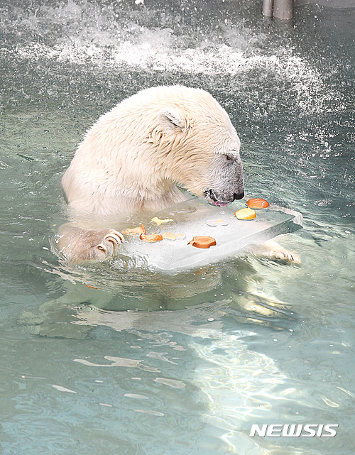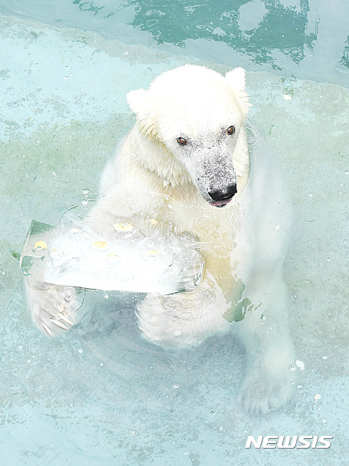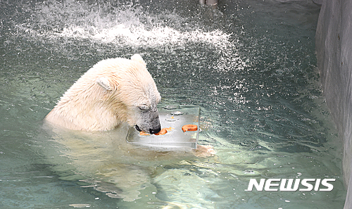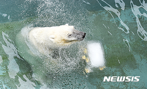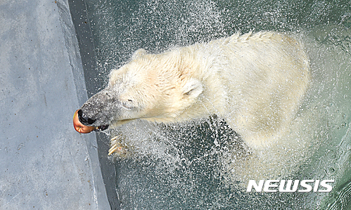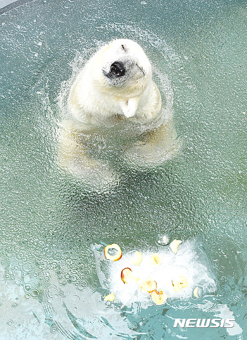 蒸し暑さが続く13日午後、大田のオーワールド動物園では、白クマが氷漬けのリンゴを食べて暑さをしのでいた。