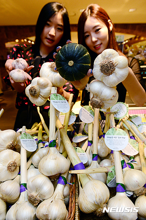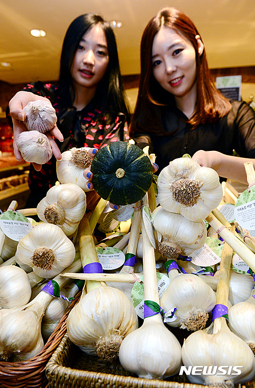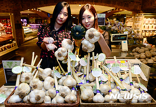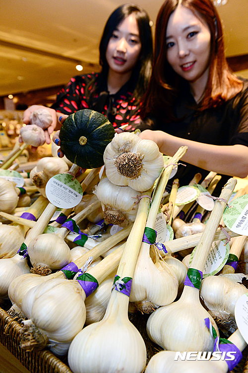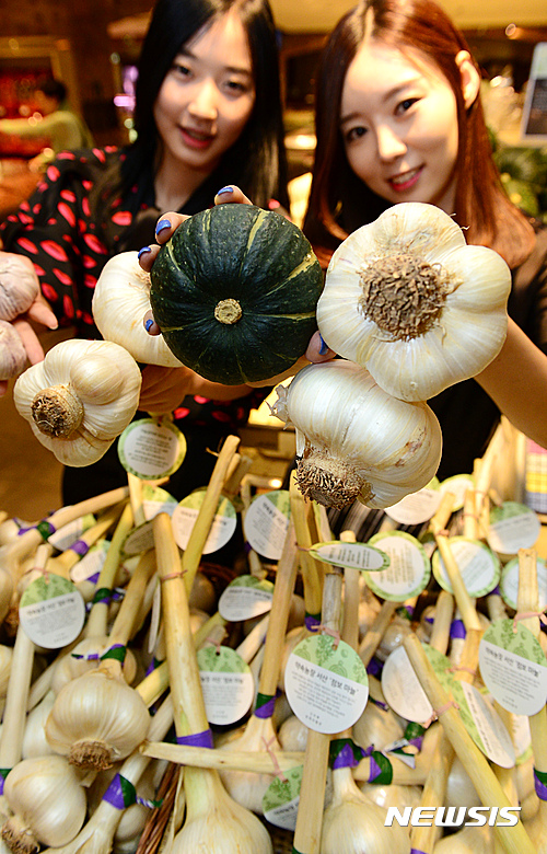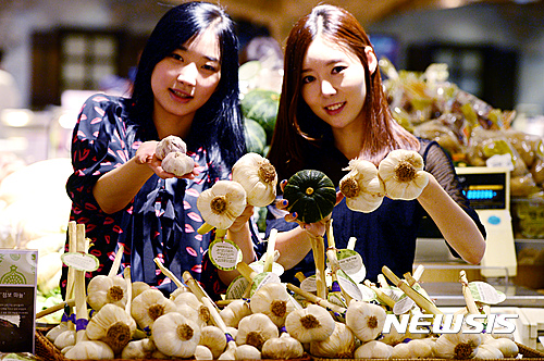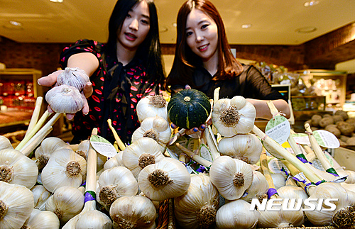 13日午前、現代デパート本店地下1階の生鮮食品売り場で、プレミアム農産物ブランド「約束農場」のジャンボにんにく販売促進キャンペーンが行われた。