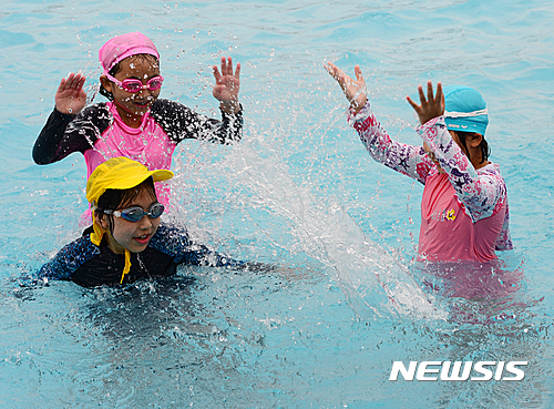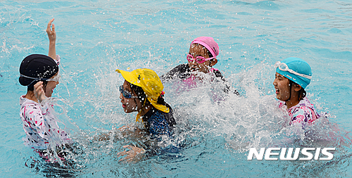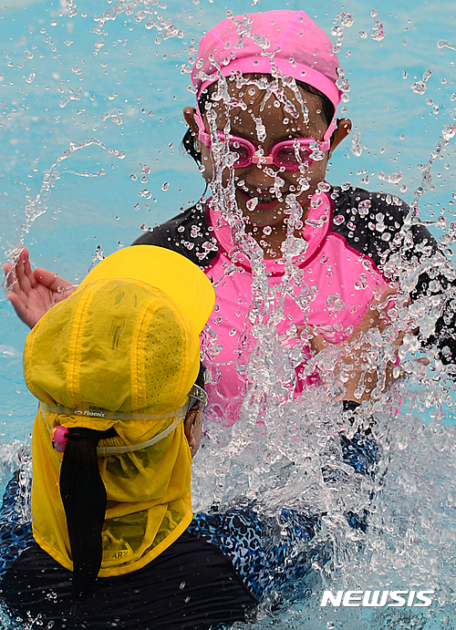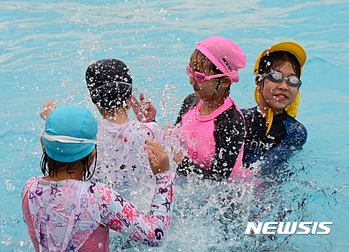 昼間の最高気温が33度まで上昇し、暑さが猛威を振るった20日、ソウル市汝矣島の漢江公園水泳場では、子どもたちが水遊びに興じていた。