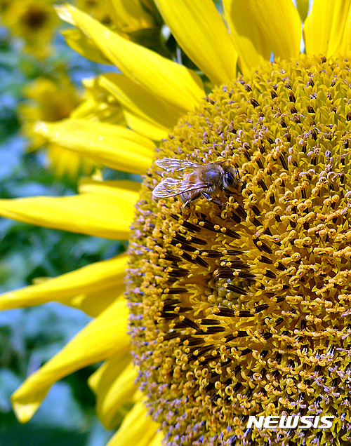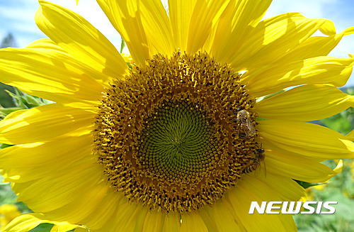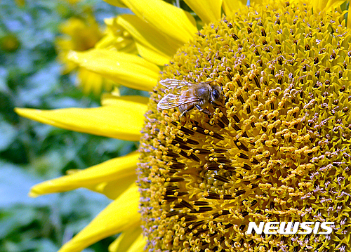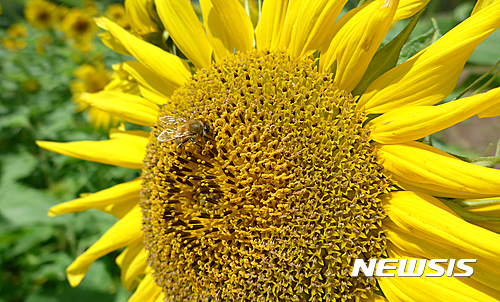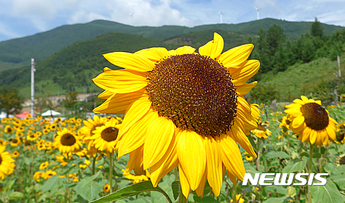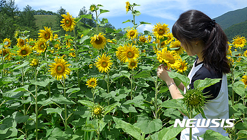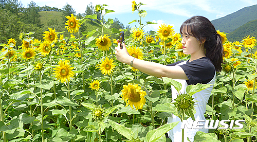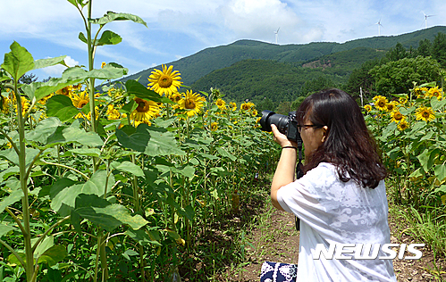22日に開幕する「第12回太白ひまわり祭り」。21日、クワウ村会場では一面を埋め尽くすひまわりを背景に一足早く写真撮影をの楽しむ姿も。