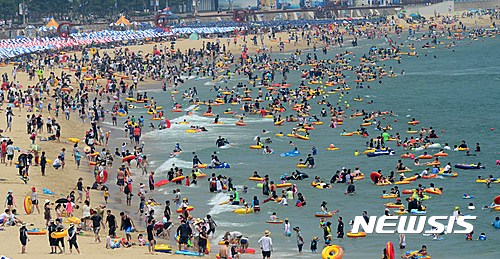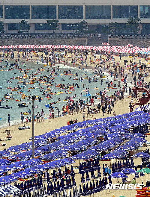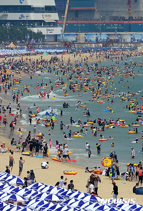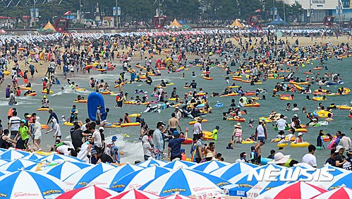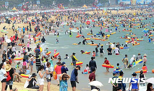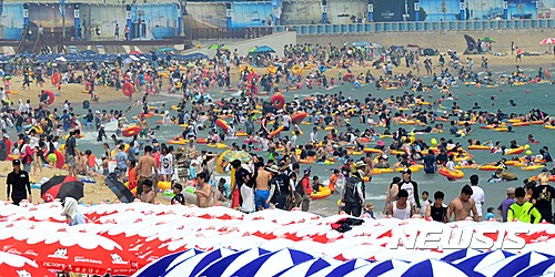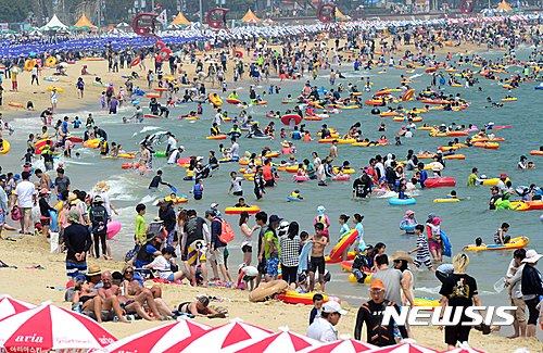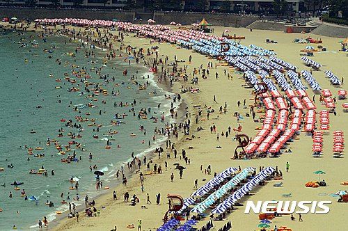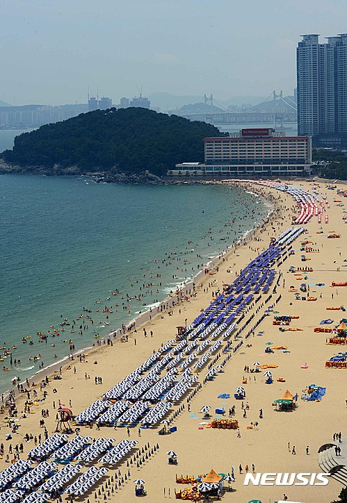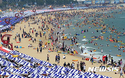 24日午後、釜山市内の海雲台海水浴場は市民や観光客でにぎわった。