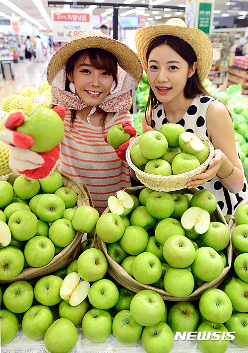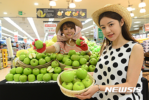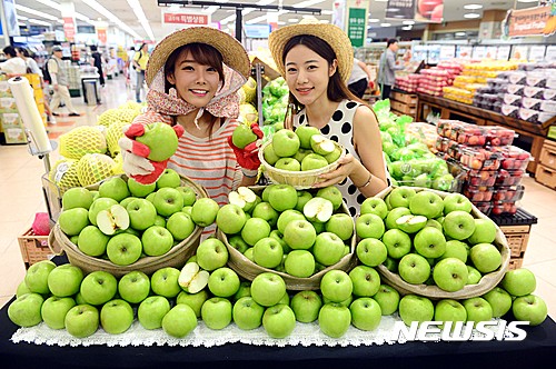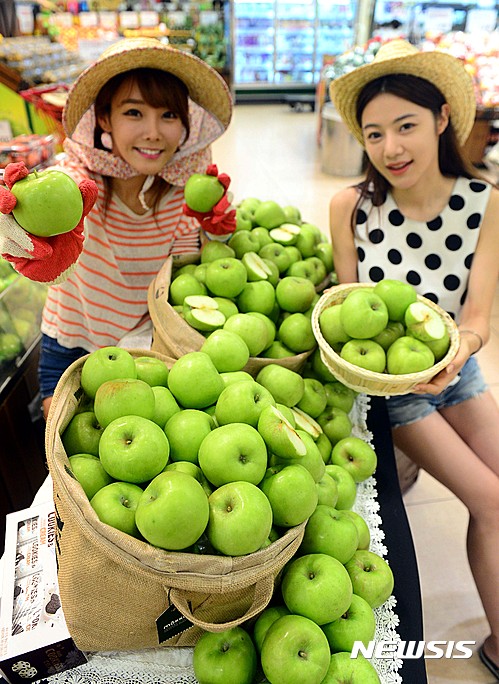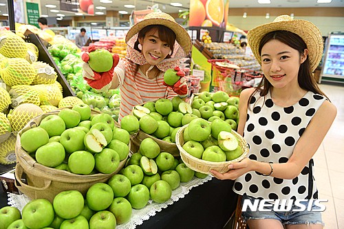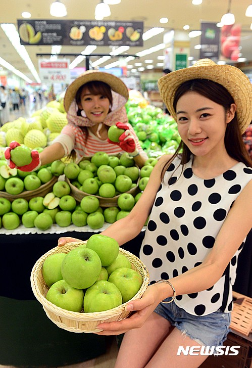 26日午前、ロッテマートソウル駅店の生鮮食料品コーナーに青りんご(つがる)が並んだ。