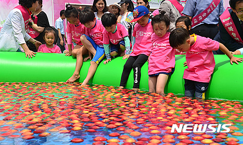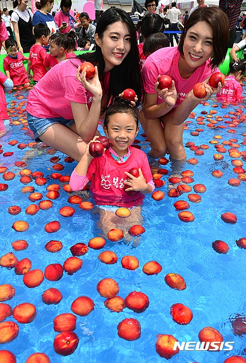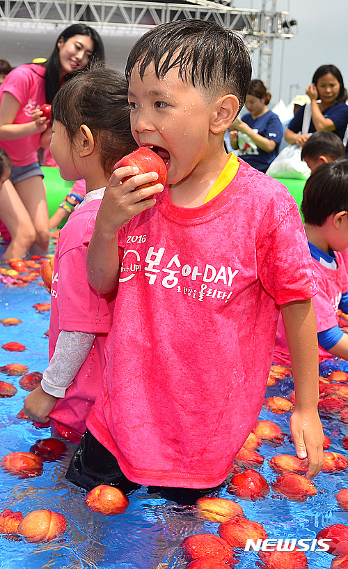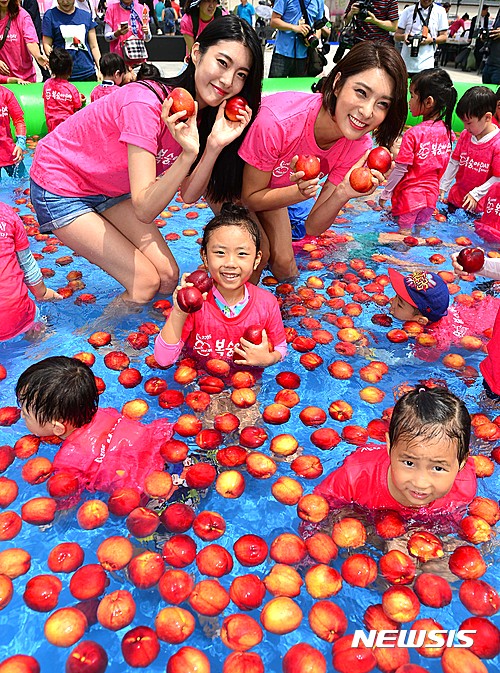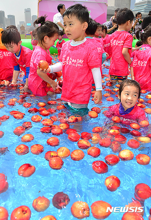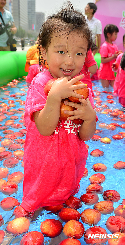 ソウル市鍾路区光化門広場で28日午前、農協と韓国モモ生産者協議会が主催する「2016モモの日」イベントが開かれた。写真は、会場に設置された「モモのプールで」水遊びを楽しむ子どもたちの様子。