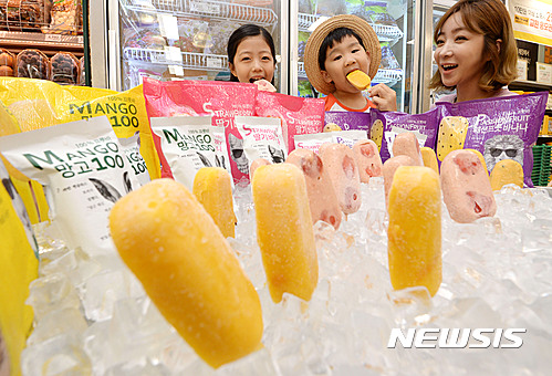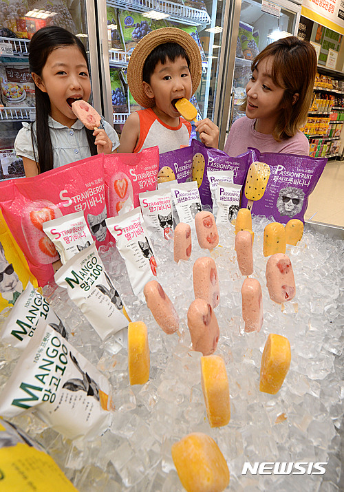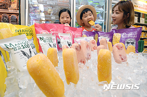 韓国各地で昼間の最高気温が35度を上回る猛暑続きの9日、ソウル市竜山のEマートでは、フルーツのアイスバーをPRするイベントが開かれた。