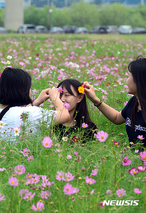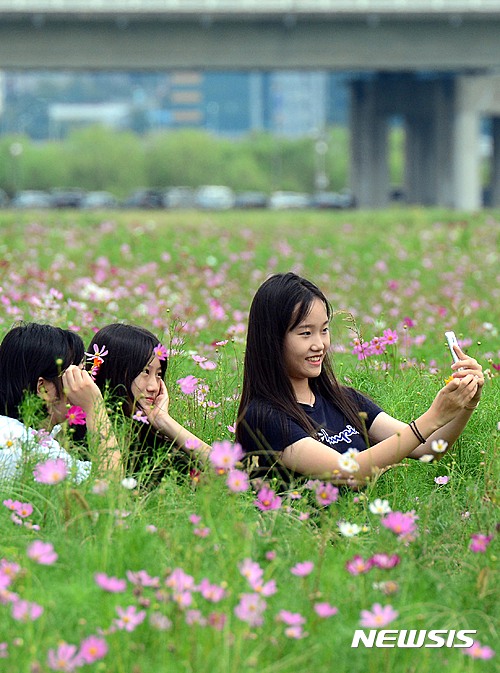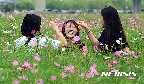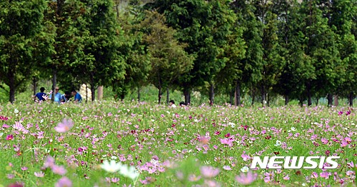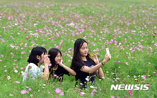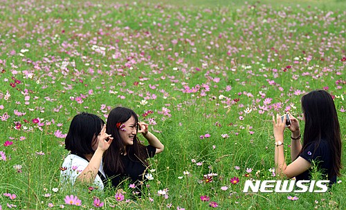暑さが峠を越えるとされる二十四節気の「処暑」まであと二日となった21日、釜山市江西区の大渚生態公園を訪れた人々。満開のコスモス畑で記念撮影をしていた。