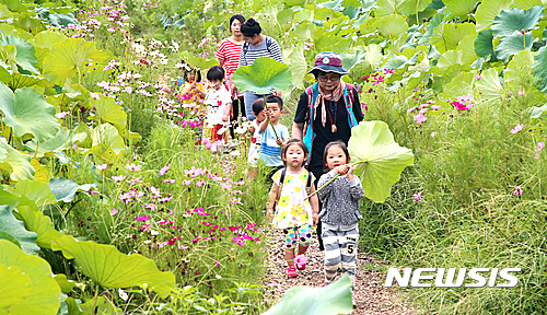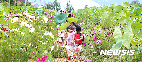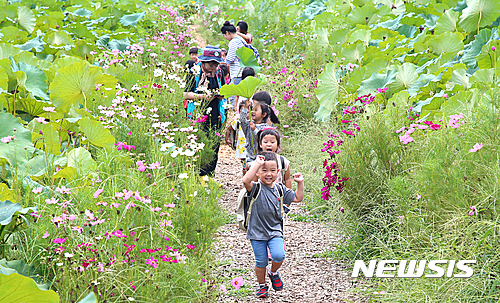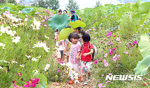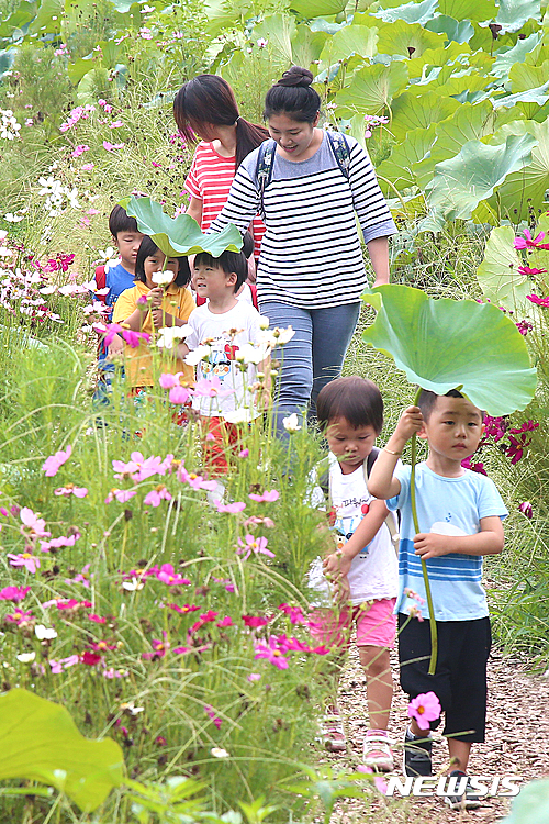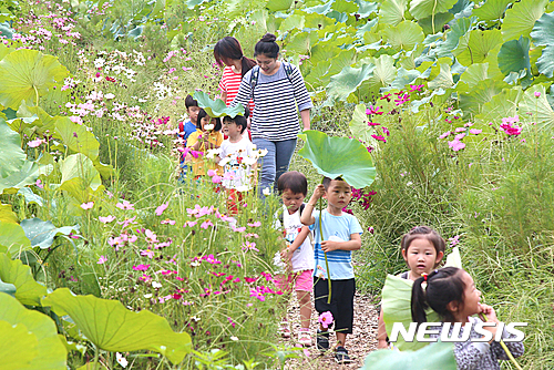 24日、山林蓮花団地(慶尚南道咸陽郡)を訪れた子どもたちが、ハスの葉を日傘代わりにコスモス道を歩いている。