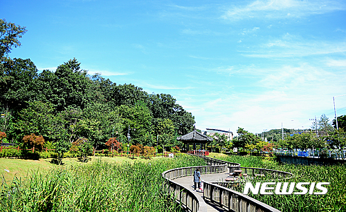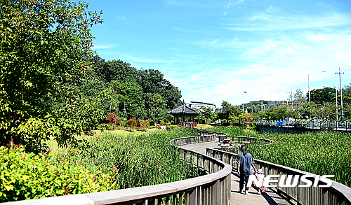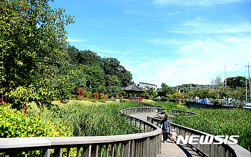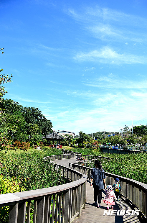 猛暑が一段落した29日午前、宮洞貯水池生態公園(ソウル市九老区)では散歩を楽しむ親子連れの姿が見られた。