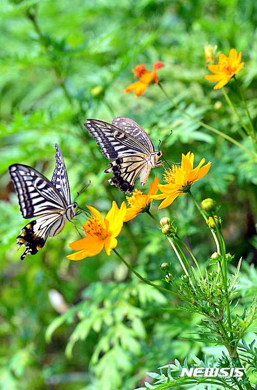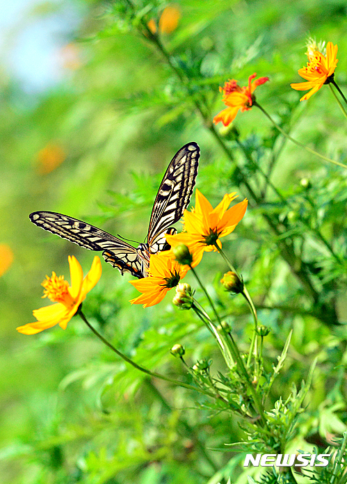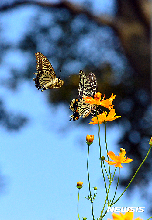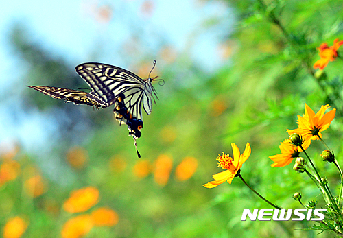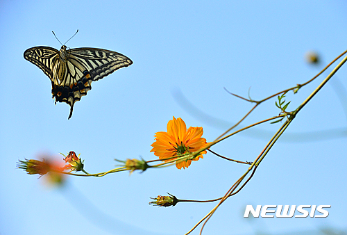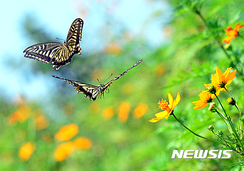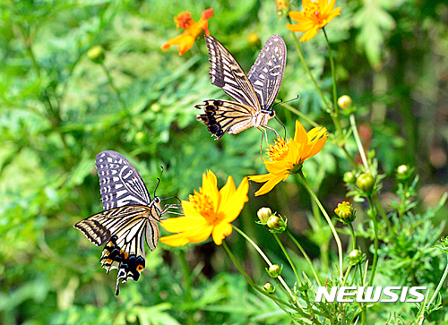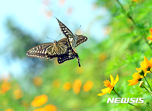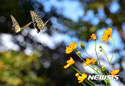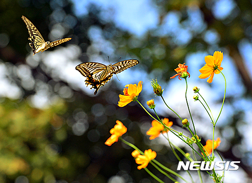 二十四節気の一つで秋が本格的に始まる「白露」が2日後に迫った5日午後、慶尚南道南海郡南面のユグ村に近い道路脇では、1組のアゲハチョウが黄色いコスモスの間を舞い飛んでいた。