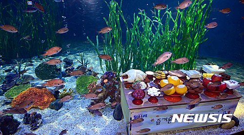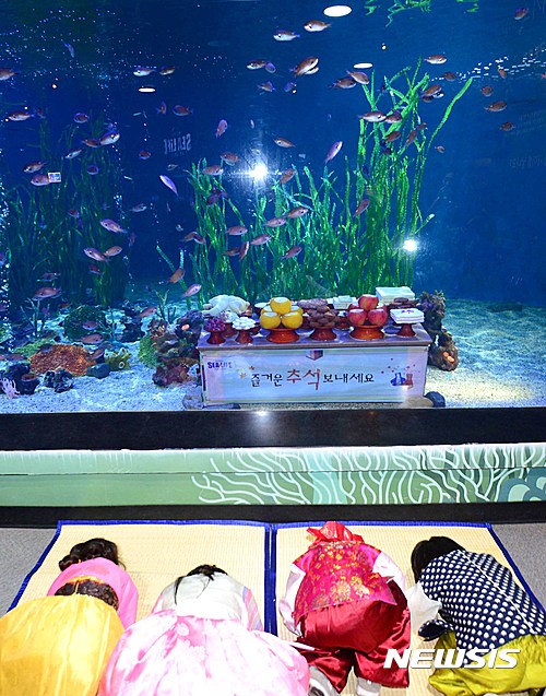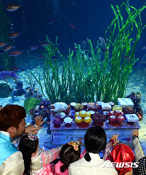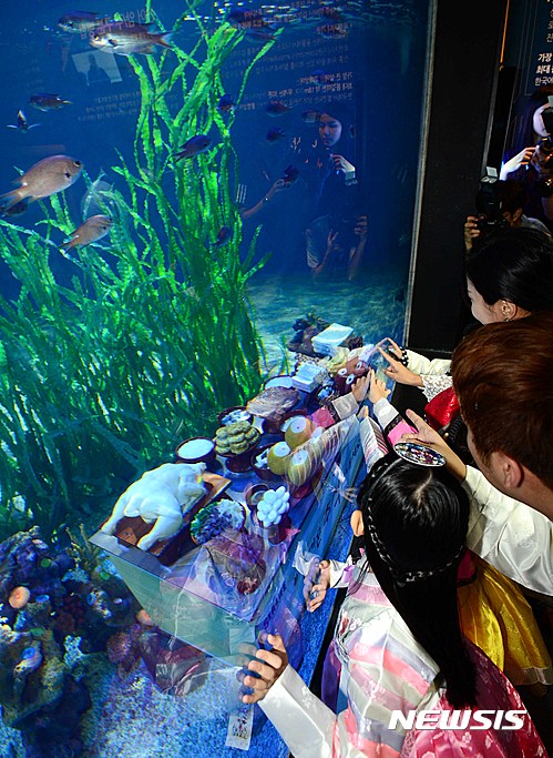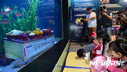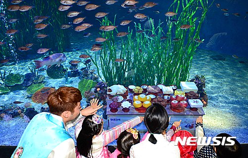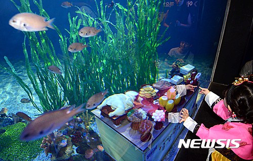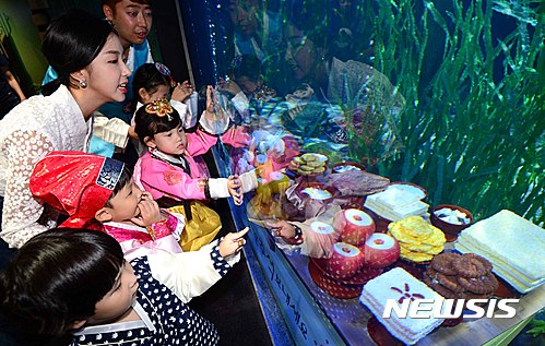 13日午前、釜山アクアリウムで職員とちびっこ広報大使らが「茶礼床(旧正月や秋夕に、先祖を供養するため祭壇に供えられる料理)」パフォーマンスを行っている。
