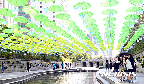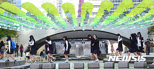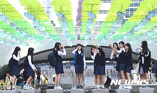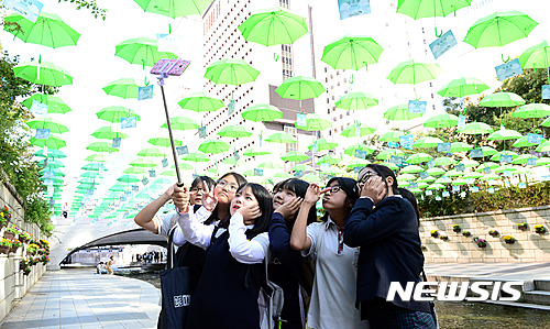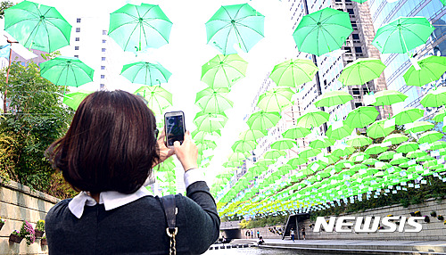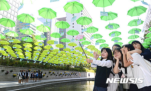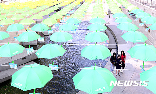 4日午前、清渓広場(ソウル市鍾路区)で「緑の傘子ども財団宣言式」が開催され、参加者たちが記念撮影を楽しんでいる。
