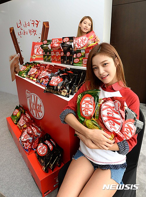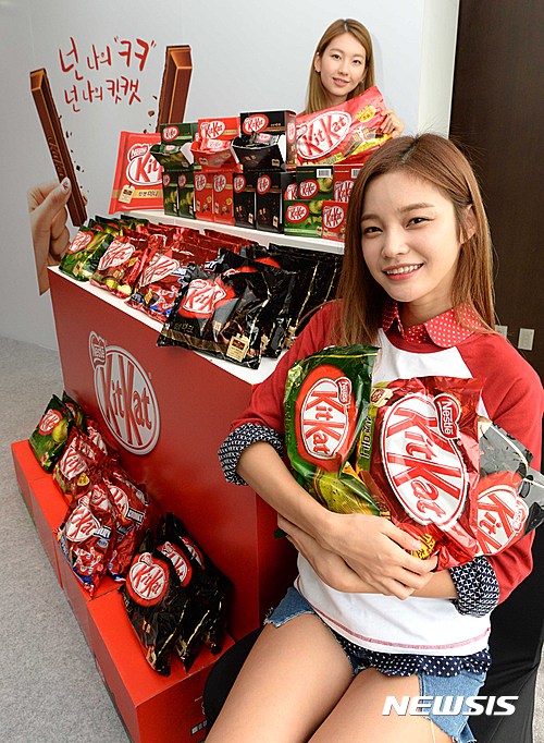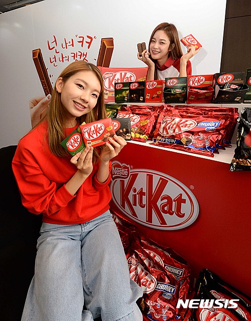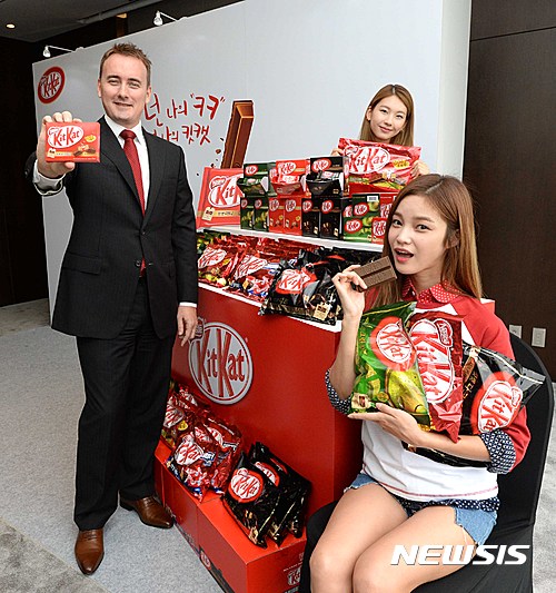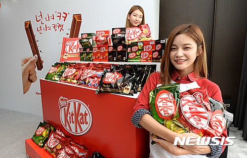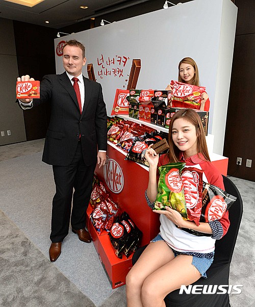 5日午前、プラザホテル(ソウル市中区)で、ネスレ・コリアが「キットカット・ダーク」「グリーンティー」などの新商品を紹介している。写真はフォトタイムに応じるキム・ジンギョンとハン・ウトゥム、ネスレ・コリア社長ら。