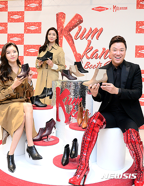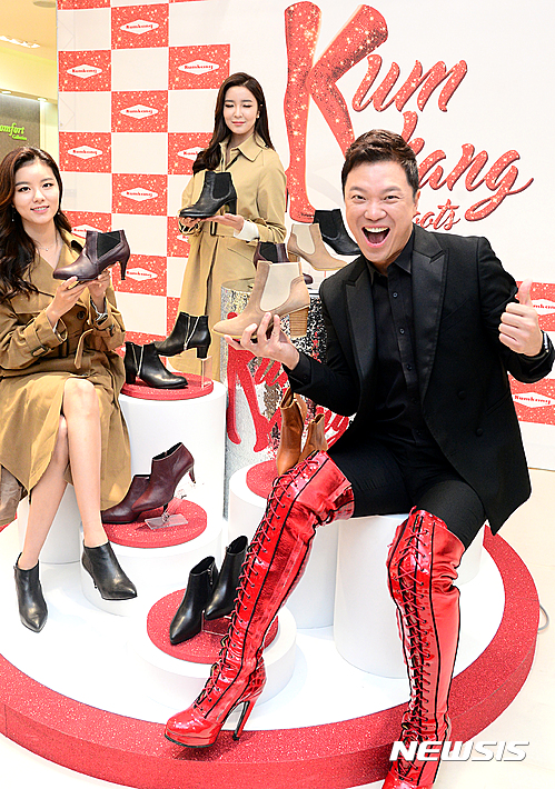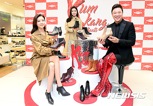 17日、金剛製靴明洞店で今秋のマストアイテム、チェルシーブーツの販売促進キャンペーンが開催された。写真はフォトタイムに応じるミュージカル『キンキーブーツ』の主人公チョン・ソンファとミスコリアたち。