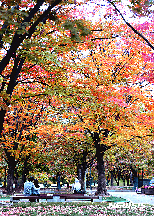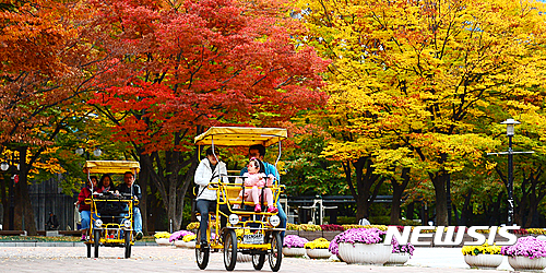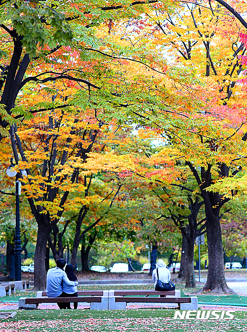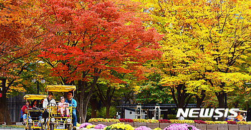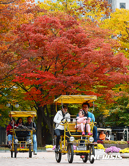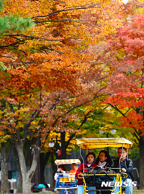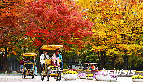 全国的に紅葉がピークに達した23日午前、ソウル市松坡区のソウル・オリンピック公園では、自転車に乗った家族連れが紅葉を楽しんでいた。