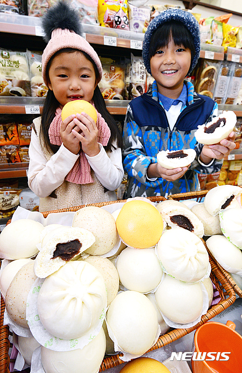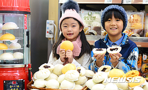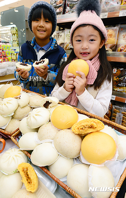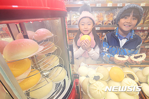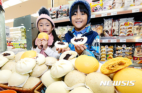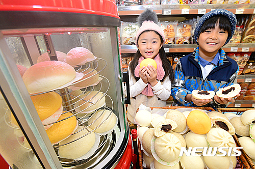 30日午前、ソウル中区の大型スーパー「ロッテマート」ソウル駅店で、寒い季節に一番人気のおやつ、中華まん(小豆あん・野菜・ピザ・カスタードクリーム入り)のPRが行われた。