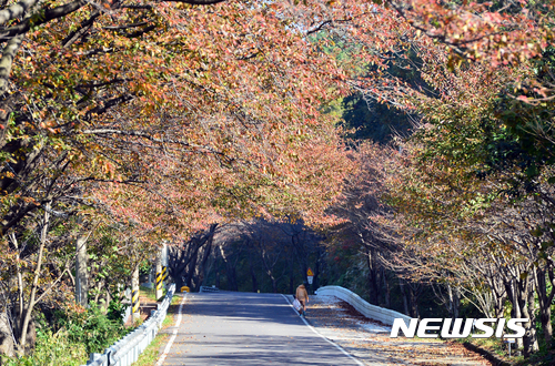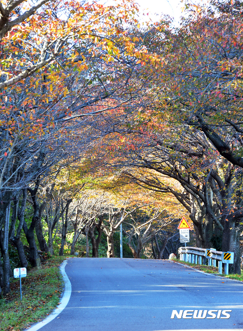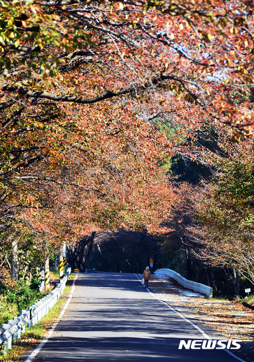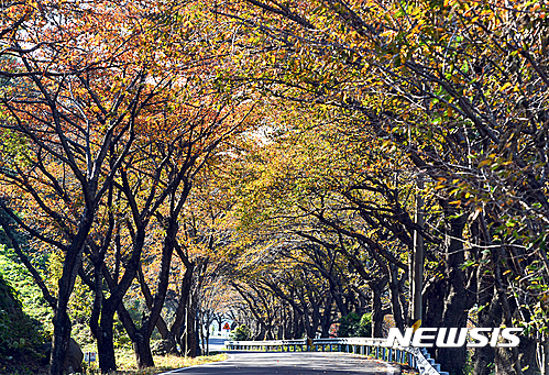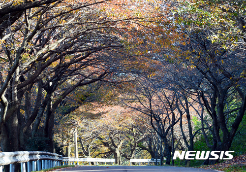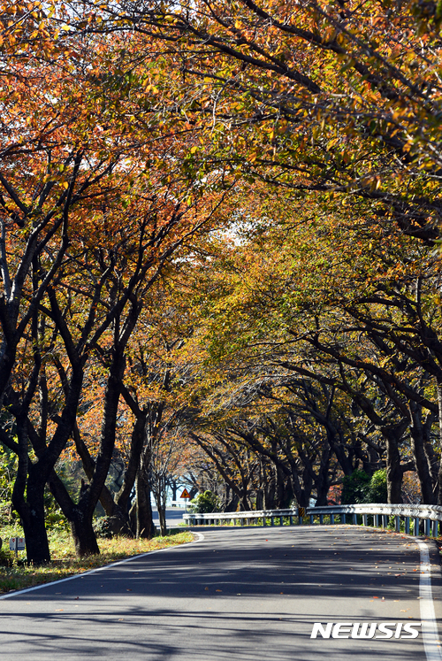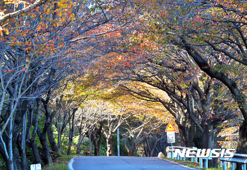 9日午後、慶尚南道南海郡雪川面のワンジ村では、路肩に並ぶサクラの木が葉を紅く色づかせ、深まる秋の趣をさらに増していた。