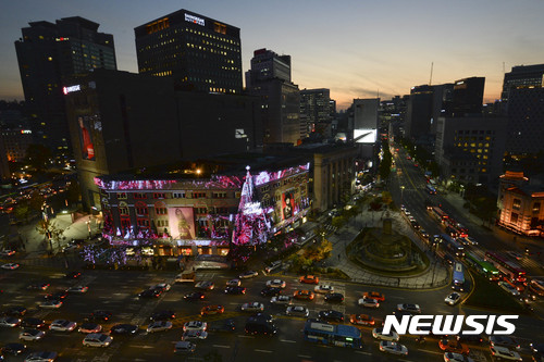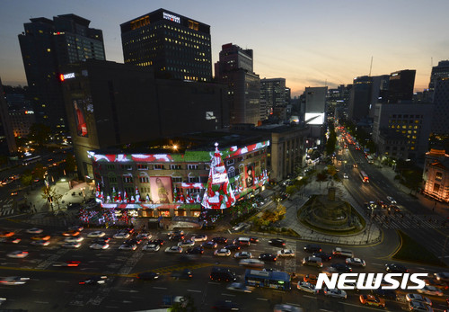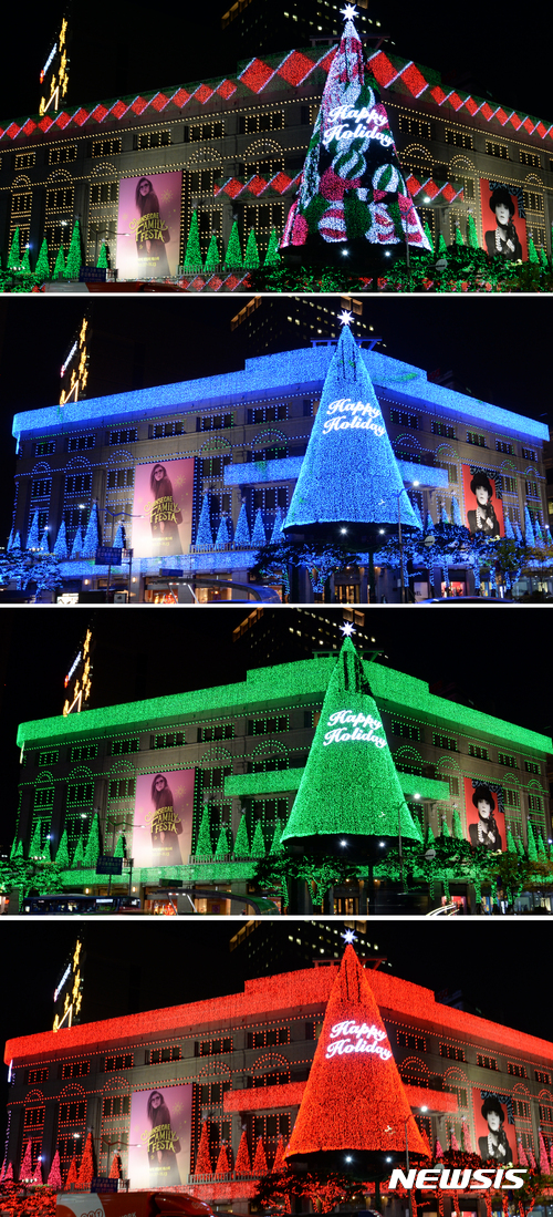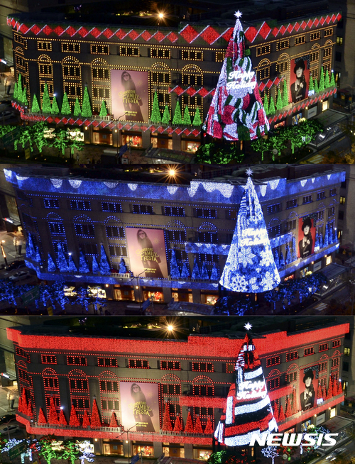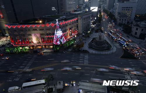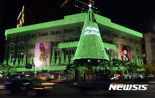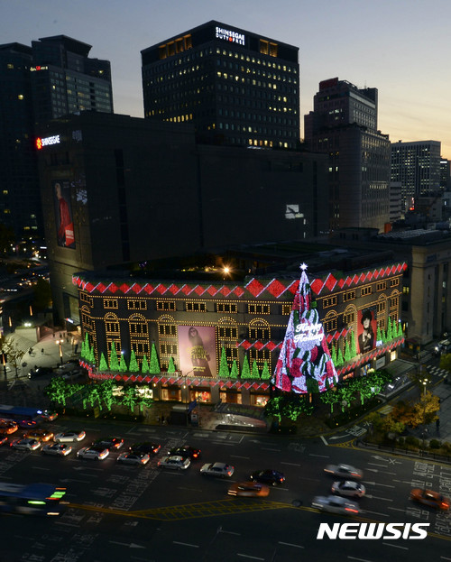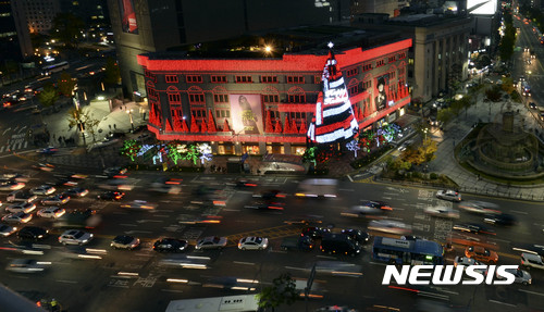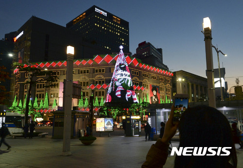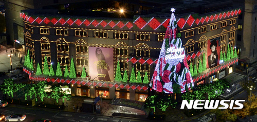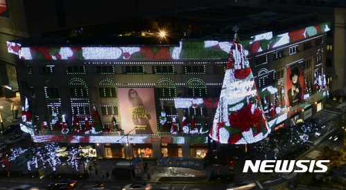 9日夜、ソウル市中区の新世界デパート本店外壁に高さ20メートルの大型ツリーが完成、イルミネーションが点灯された。