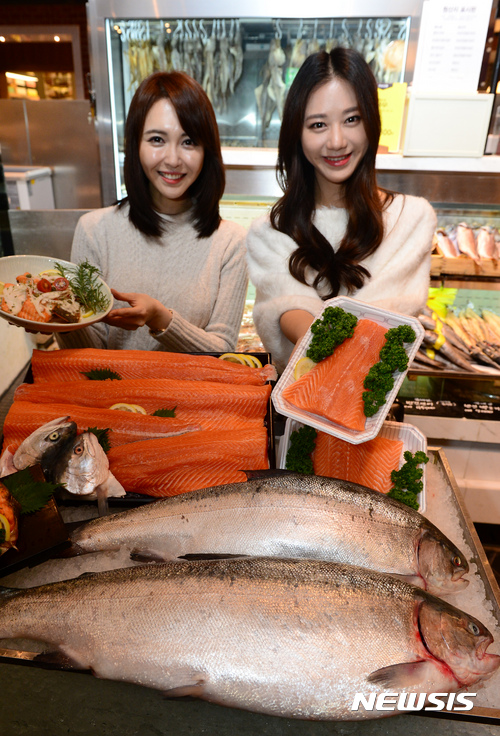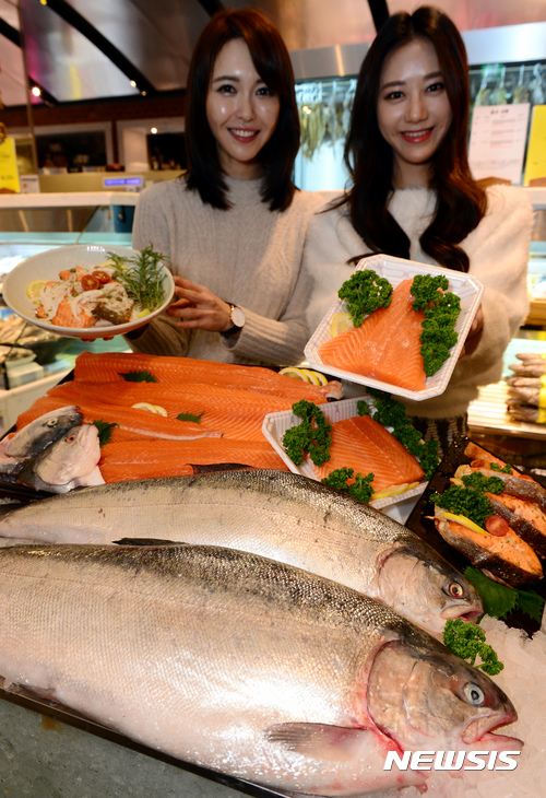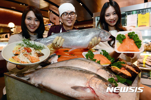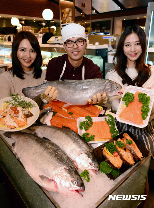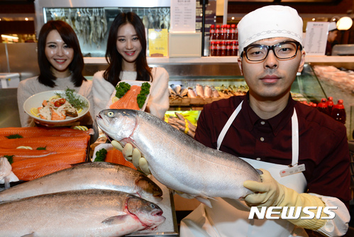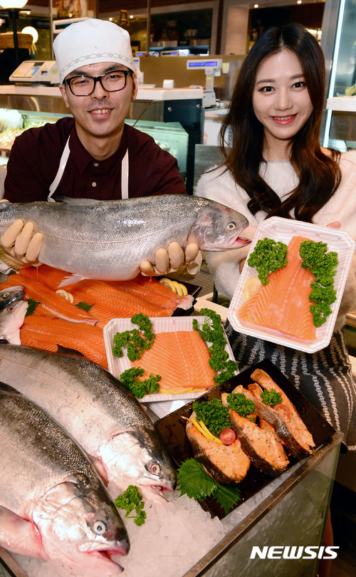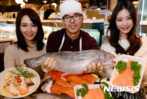 新世界デパート本店(ソウル市中区)食品売場の水産コーナーで21日午前、韓国国産の養殖サケの販促イベントが行われた。