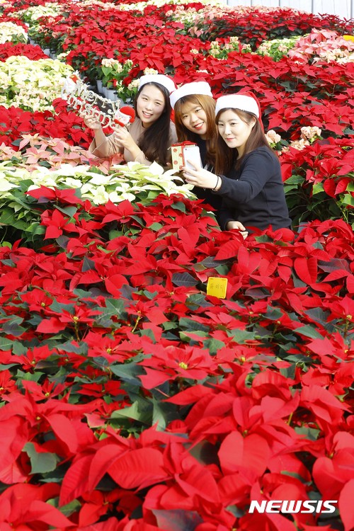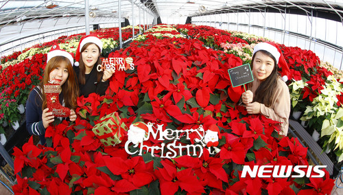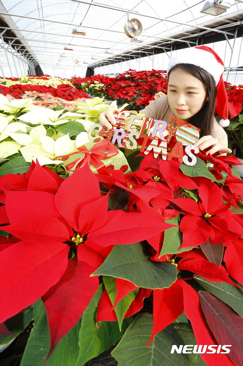 国立園芸特作科学院(全羅北道完州郡)の花卉(かき)温室で、「クリスマスフラワー」と呼ばれるポインセチアの様子を見る研究員。