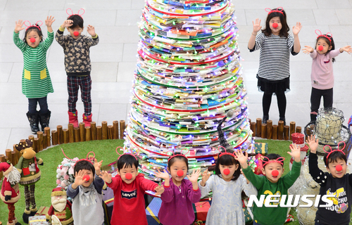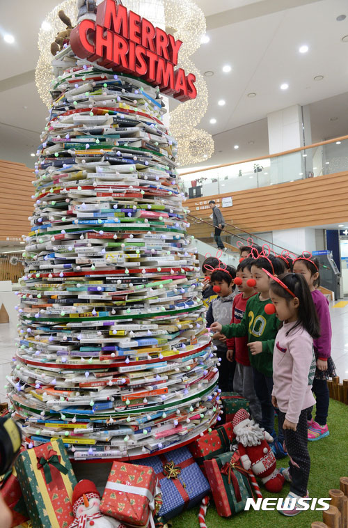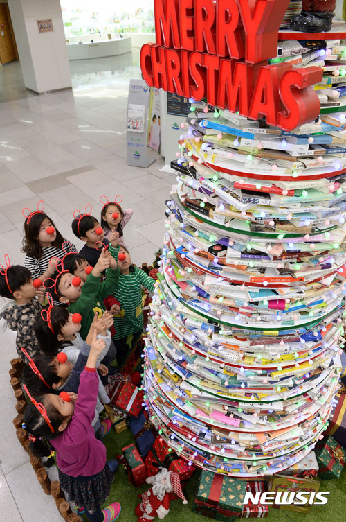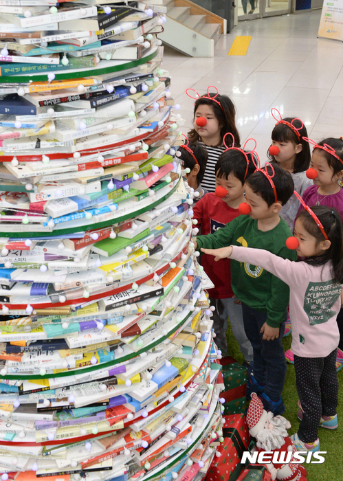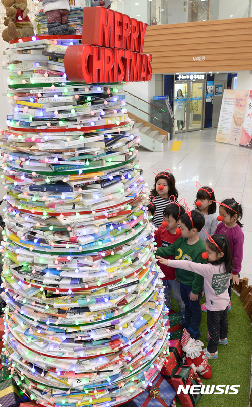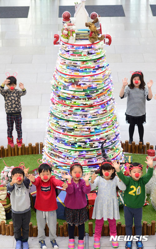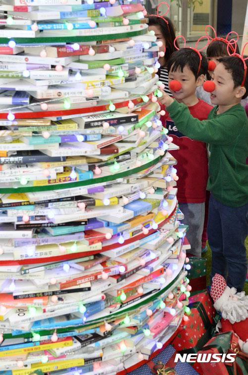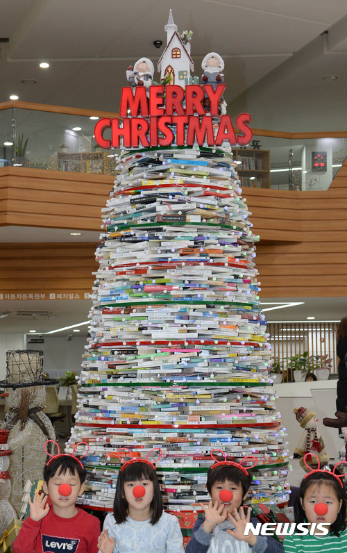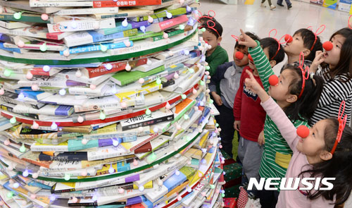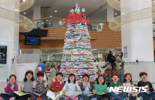 5日午前、ソウル市の松坡区庁で、住民らが寄付した約800冊の本で作られたツリーを背景に、子どもたちが記念撮影を行っている。