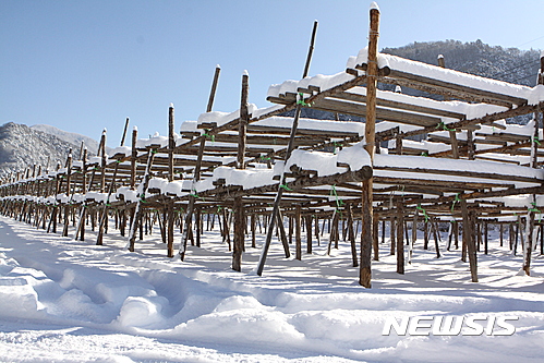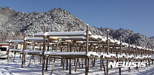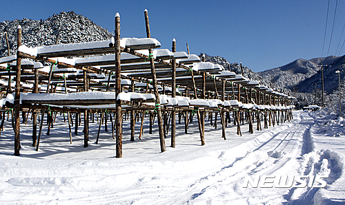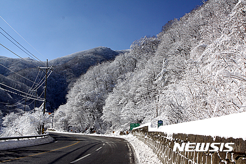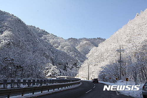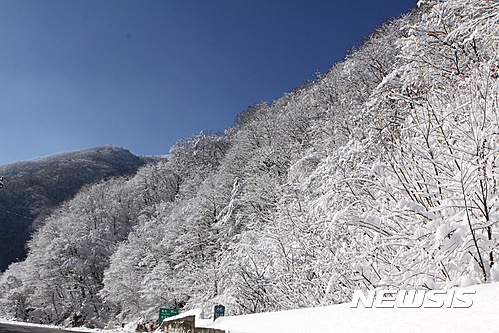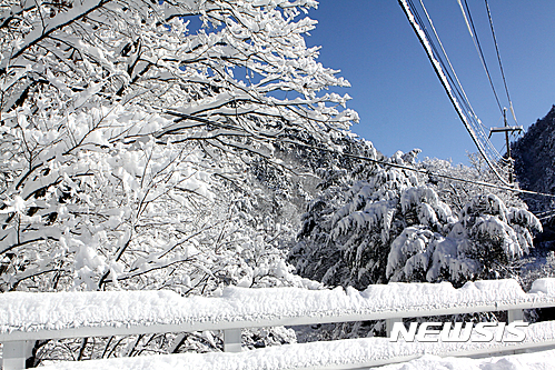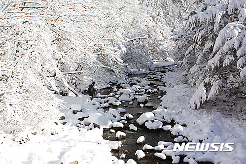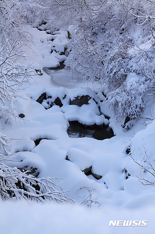 15日、江原道麟蹄郡北面の弥矢嶺渓谷は前日の大雪で白く覆われ、見事な景色を作り上げていた。