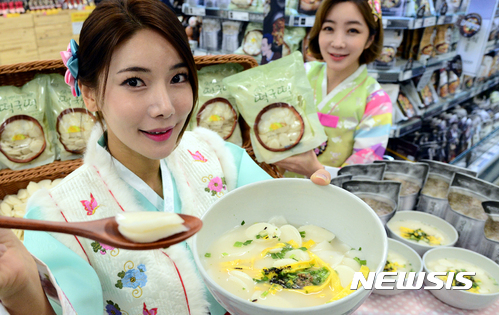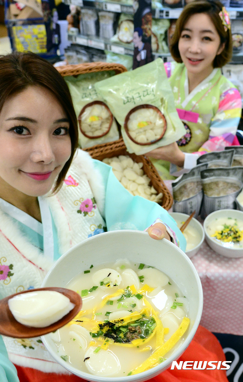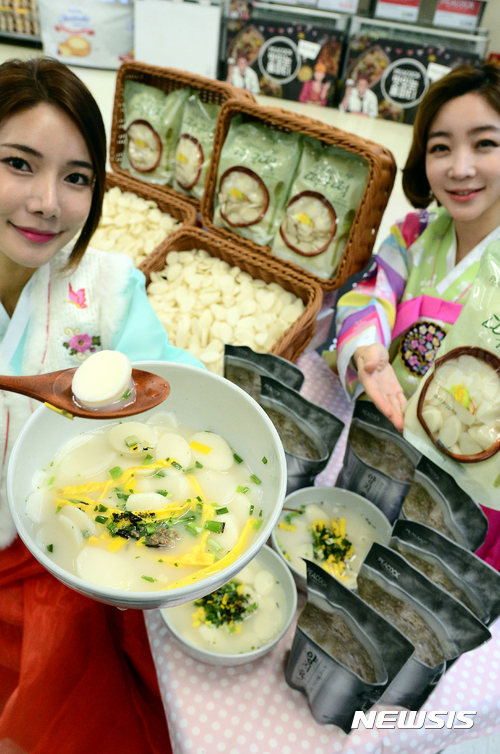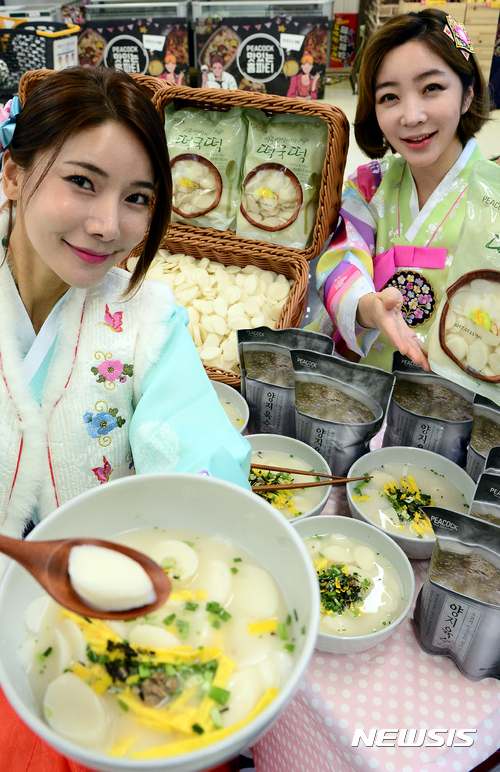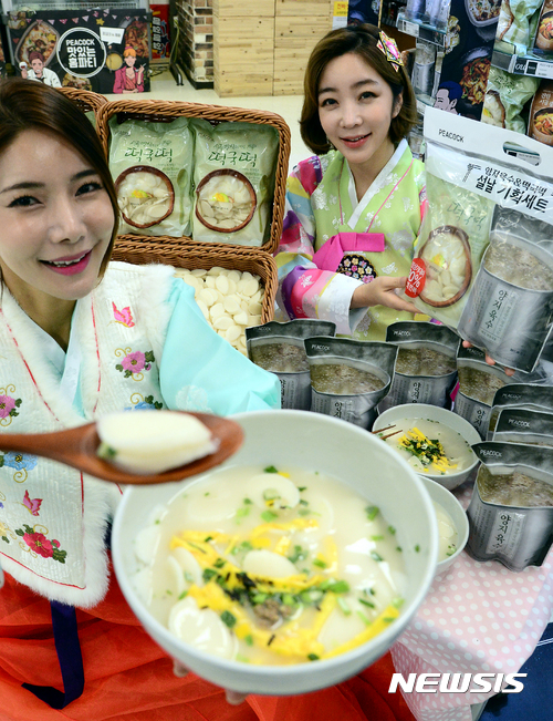 ソウル市竜山のEマート竜山駅店で27日、簡単に調理できるピーコックのトックク(韓国風雑煮)用トック(モチ)とヤンジユクス(牛ムネ肉のだし)の販促イベントが開かれた。