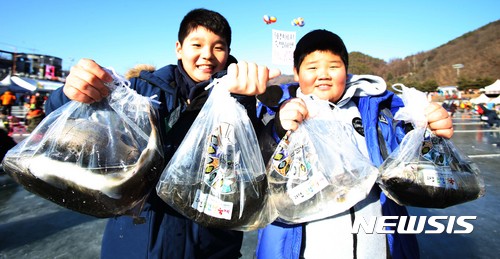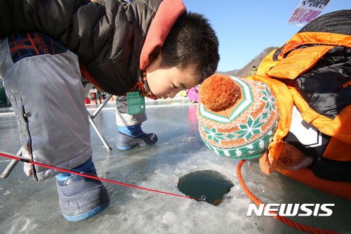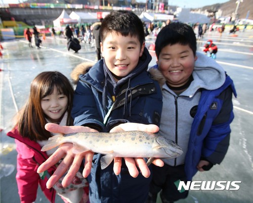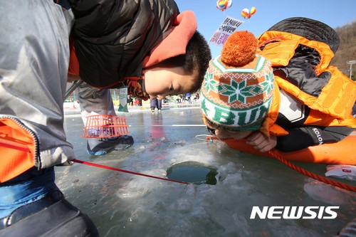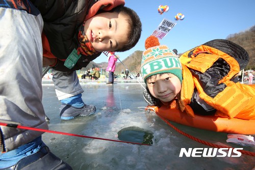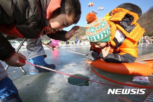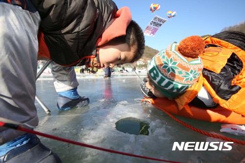 「氷の国・華川ヤマメ祭り」開幕二日目の15日午後、江原道華川郡の会場で、ヤマメ釣りに夢中になる子どもたち。