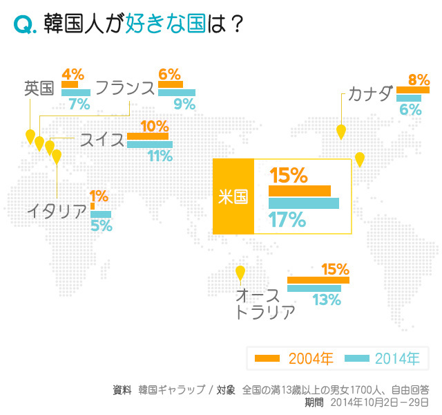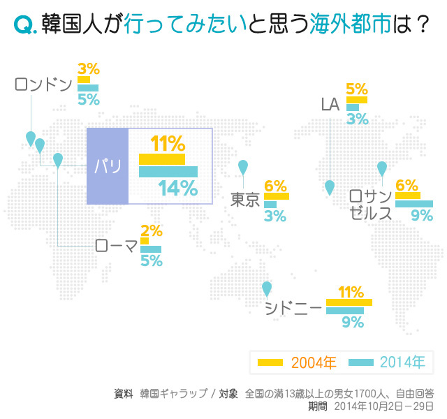 そのほか、韓国を除き、好きな国、行ってみたい都市はどこか、10年前の結果とはどのように変わったのか、韓国ギャラップが調べた結果を基にまとめてみた。