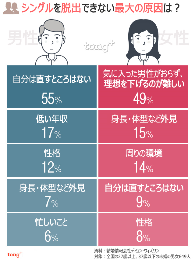 未婚の男女の最優先目標は、何と言ってもシングル脱出だ。では、そんな男女にとってシングル脱出を邪魔しているものはないのだろうか。男性の場合、「自分は直すところがなく完璧だ」(55%)と考えている人が最も多く、女性の場合は「目の高さなどマインド」(49%)という答えが多かった。結局、男女とも自信や自らの努力によって、いつでもシングル脱出できると考えているということだ。では、未婚の男女のシングル脱出に対する認識を見てみよう。